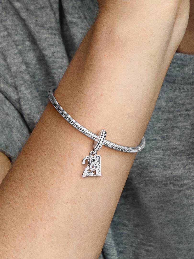 Mark a major milestone with this celebration charm. A lasting birthday greeting or gift for someone who never feels their age, our expertly crafted sterling silver dangle is shaped as the number 21, set with glittering c,ubic zirconia and a miniature infinity sign. It can be worn as a charm on Pandora Moments bracelets or as a pendant on a favorite necklace ?C because we all feel forever 21.