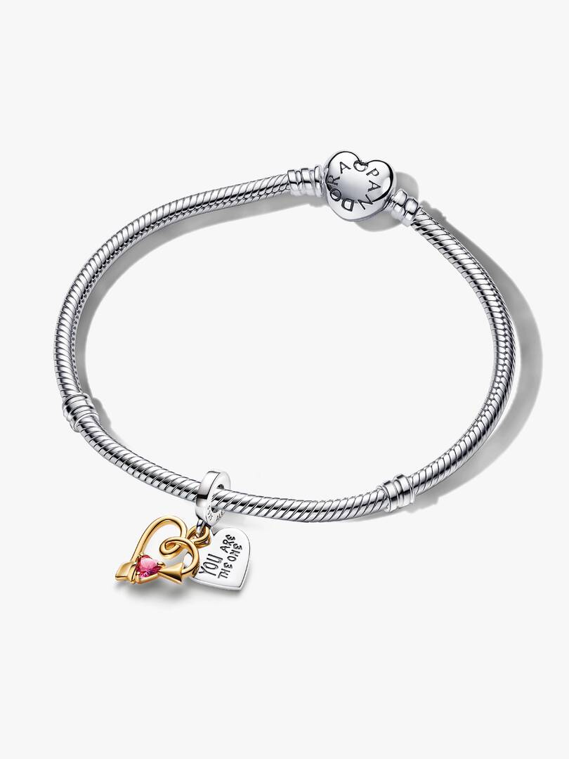 The Arrow of Love Bracelet and Engravable Charm Set is a perfect pairing for those who wish to celebrate love. The Engravable Heart & Arrow Double Dangle Charm features a sterling silver heart with the engraved message “,YOU ARE THE ONE” and a blank canvas for personalization. Cupid??s arrow, crafted in 14k gold plating and set with a heart-shaped red stone, adds a touch of romance. The set is completed with the Pandora Heart Clasp Bracelet, a sterling silver snake chain bracelet featuring a heart-shaped clasp. Wear it as a standalone statement or add your favourite charms to make it uniquely yours.