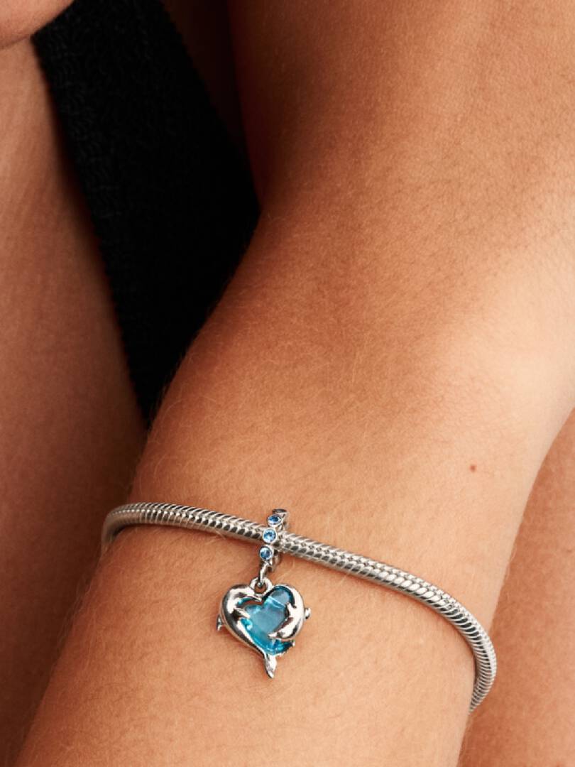 Dive into the world of playful guardians of the sea with this charming dangle, where two dolphins dance around a beautiful Murano glass heart.