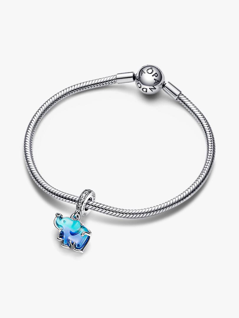 The Blue Murano Glass Elephant Dangle Charm is a colorful ode to a majestic creature. Sterling silver forms an elephant-shaped silhouette around a gradient blue-and-purple Murano glass with a raised ear and a concave rou,nded eye. Realistic elephant details include an uplifted trunk, feet and a swirling line forming a tail. The bail features a row of pav?? and the engraved word “LUCKY.” Inspired by the majestic Asian tropical elephant, this charm makes a thoughtful and meaningful gift.