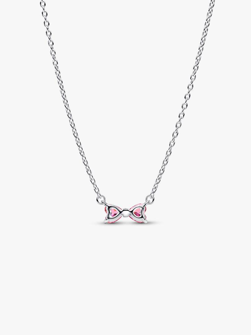 Tied with love. On this sterling silver necklace, two pink heart-shaped stones form a bow that’s fixed to the chain. Adjustable to three different lengths, add it to your stack for a touch of grace and beauty.