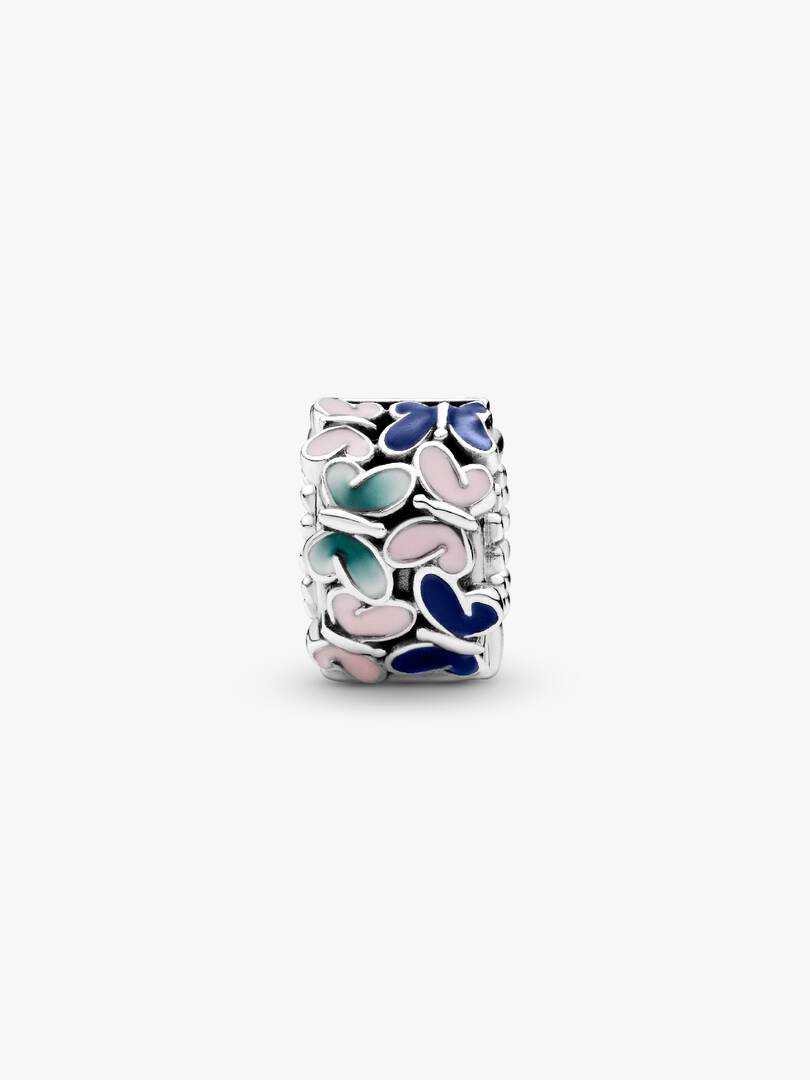 Add a dose of color to your look with this clip charm hand-finished in sterling silver. Detailed with a swarm of butterflies, the meaningful charm features vibrant hand-applied enamel. It’s the perfect piece to create a ,garden-inspired look on your favorite bracelet. Wear the clip charm to help you evenly space your chosen charms with style. This clip charm features no silicone grip, so it will slide if not styled onto threads (two raised charm dividers).