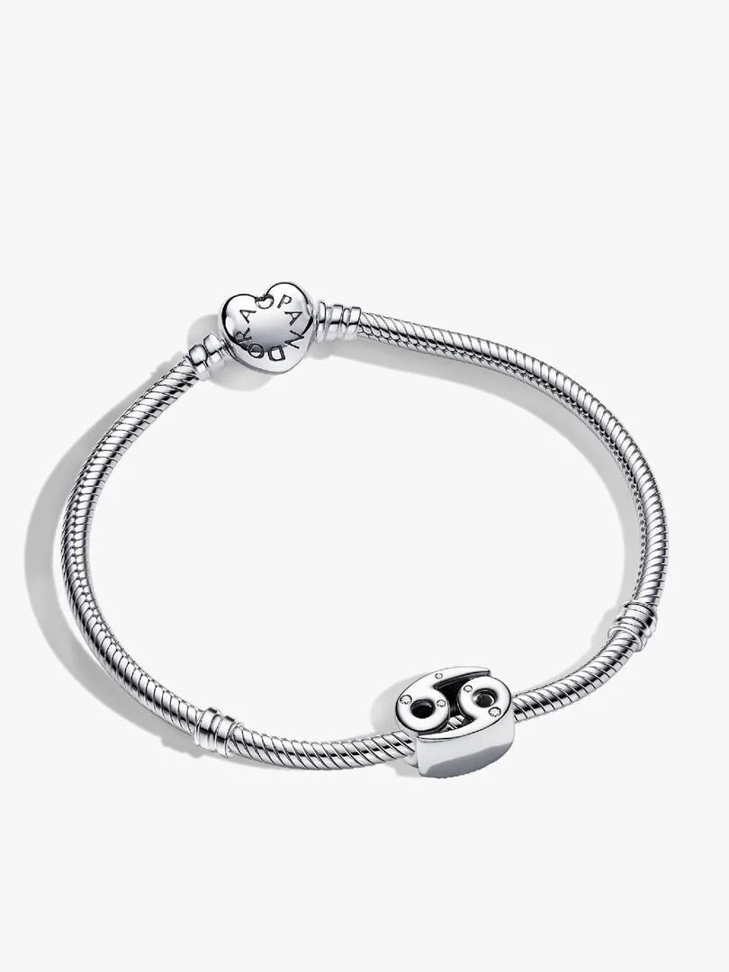 Let your Cancer pride shine with this sterling silver set featuring a sparkling zodiac charm. Cancers are traditionally known for being highly intuitive and their psychic abilities often manifest in tangible ways. The Ca,ncer charm has two distinct sides, one polished with cubic zirconia dotted around and the other beaded with stars for that extra celestial touch. Pre-styled on a matching Heart Clasp Snake Chain Bracelet, wear it as a reminder of your zodiac sign??s strengths or gift to the charm-loving Cancer in your life.