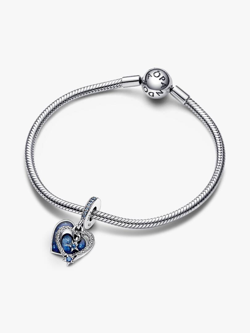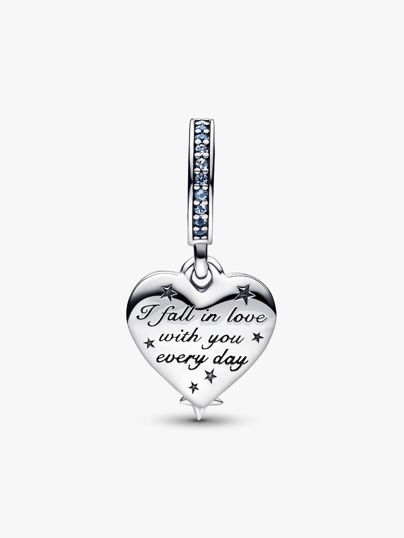 Two shooting stars come together to create a heart-shaped outline in this playful and romantic double dangle charm, crafted in sterling silver. Each star is set with a blue man-made crystal and the star trails feature cl,ear cubic zirconia pav??. Behind the stars, a swirling galaxy effect shows through from the back part of the dangle, created with shimmering enamel in different shades of blue. The back of the enamelled part is engraved with the message “I fall in love with you every day.” Capture the magic of the night sky and gift it to the one you love.