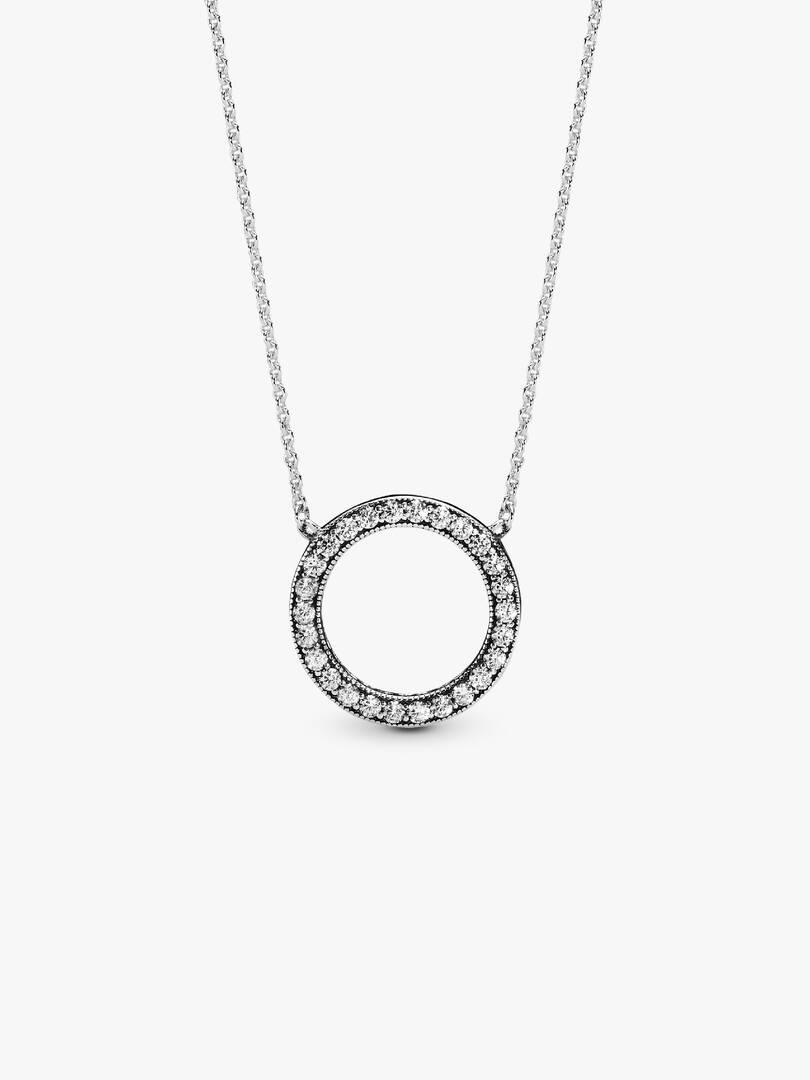 Bring your outfit full circle with this sparkling necklace crafted in sterling silver. The reversible pendant is framed with shimmering stones on one side, and embossed with the Pandora logo on the reverse ?C enabling you, to create two different looks. For extra versatility, the delicate chain is adjustable to three different lengths. Pair this circle necklace with the matching Circle of Sparkle Earrings for maximum glamor.