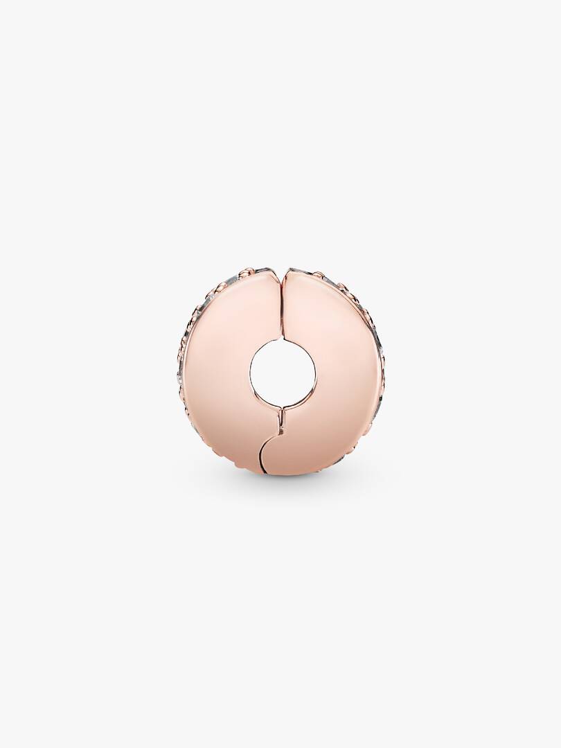 You don’t have to shout to make a strong statement. Our 14k rose gold-plated Clear Pav?? Clip Charm adds a powerful touch to your bracelet, bringing both balance and beauty. It’s pav??-set with cubic zirconia that lend spa,rkle to your look. Clip multiples onto your bracelet to create a symmetrical styling, or add a single piece for a minimalist look. Your mood sets the tone. This clip charm features a silicone grip, does not fit onto threads (two raised charm dividers.) This charm can be styled anywhere else on the bracelet.