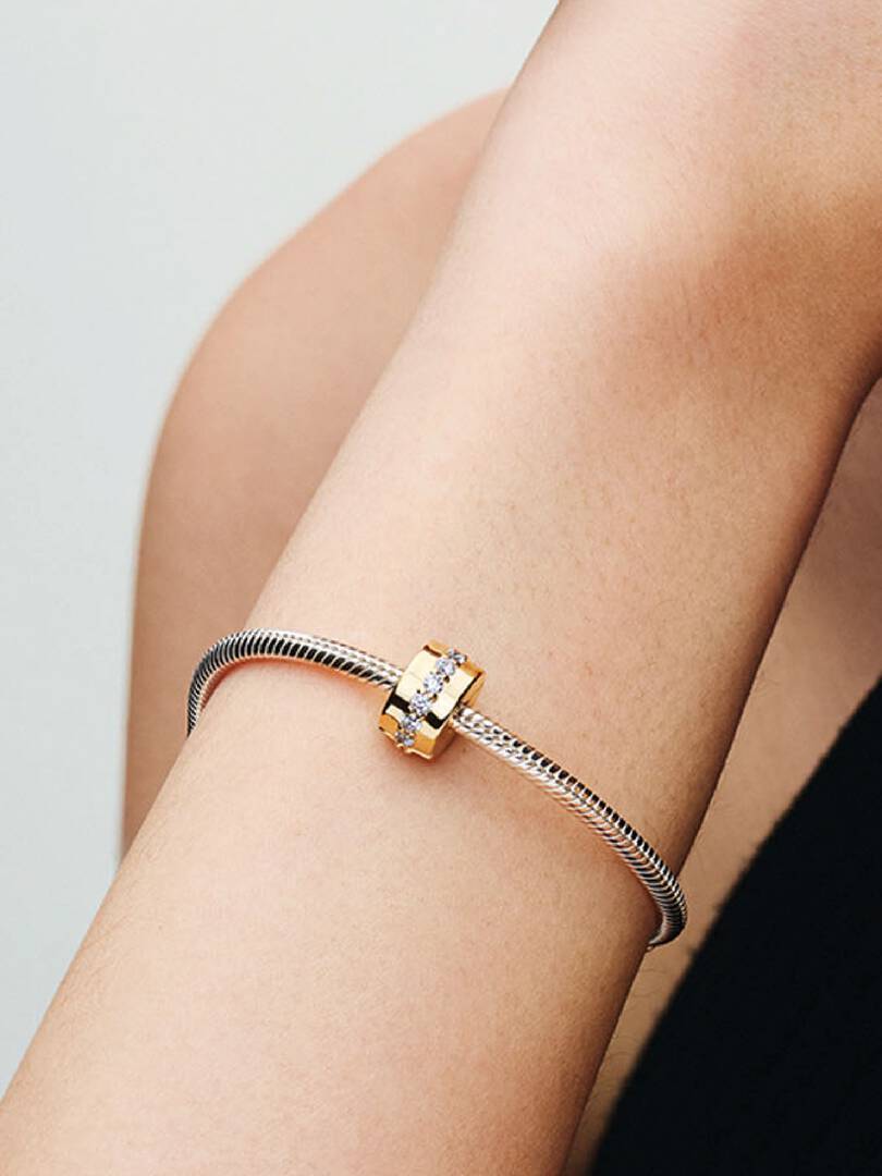 Bring balance to your Pandora charm bracelet with this sparkling clip charm. This sleek 14k gold-plated piece is accented with a row of shimmering clear cubic zirconia stones. This clip charm features no silicone grip, s,o it will slide if not styled onto threads (two raised charm dividers).
