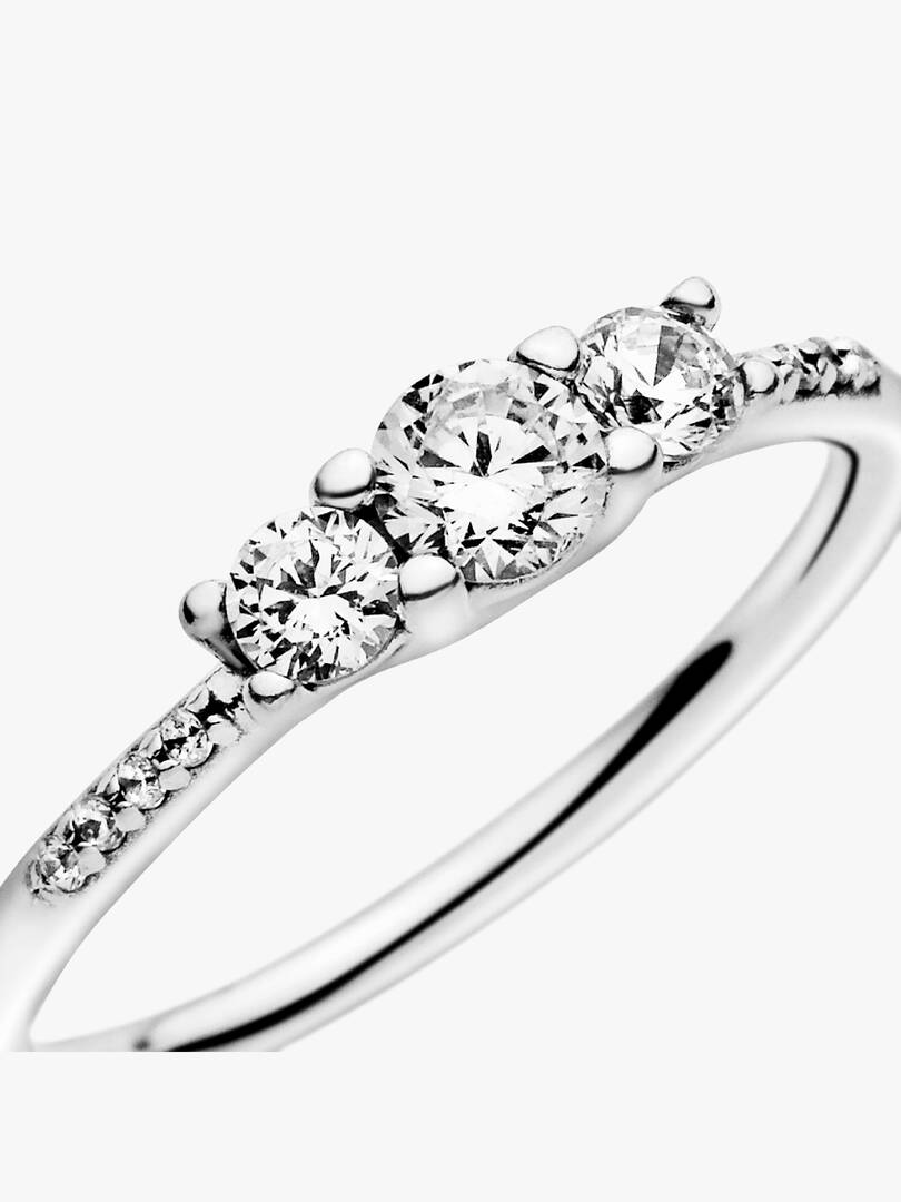 Lend a touch of sparkle to every occasion with this timelessly elegant ring. Beautifully crafted in sterling silver, the classic design features a trio of brilliant-cut cubic zirconia stones, surrounded by tiny shimmerin,g stones. Let it shine on its own, or mix and match with other Pandora rings for a modern twist.