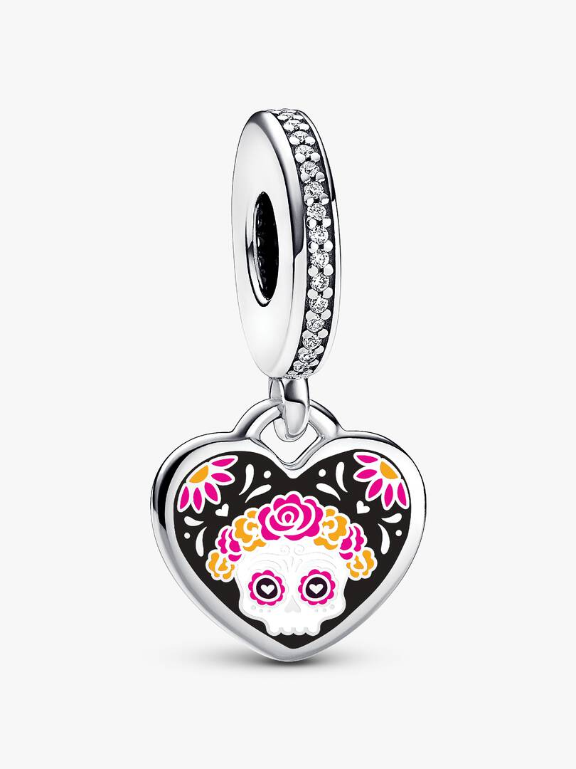Celebrate the spirit of D??a de los Muertos with the Day of the Dead Sugar Skull Charm. This heart-shaped dangle charm is beautifully crafted in sterling silver and features a row of sparkling cubic zirconia on the bale, ,adding a touch of sparkle. The heart itself is engraved with a traditional sugar skull design, complete with a colorful flower crown, and adorned in vibrant shades of black, pink, and orange. A meaningful tribute to the tradition of honoring loved ones, this charm is perfect for bringing joy and remembrance to your collection.
