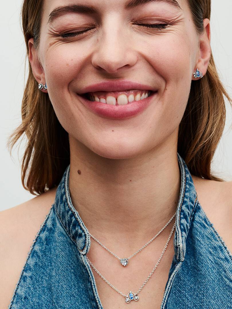 Follow the call of the ball with the Disney Cinderella’s Carriage Collier Necklace from Disney x Pandora. This sterling silver necklace features an intricate pendant inspired by Cinderella’s enchanted pumpkin carriage, w,ith a blue marquise-shaped stone surrounded by swirling openwork details. Small cubic zirconia stones sparkle on the wheels and pumpkin stem. The pendant is fixed to the chain, and the necklace is adjustable to three lengths. Style it together with the matching stud earrings for an elevated Cinderella-inspired look.