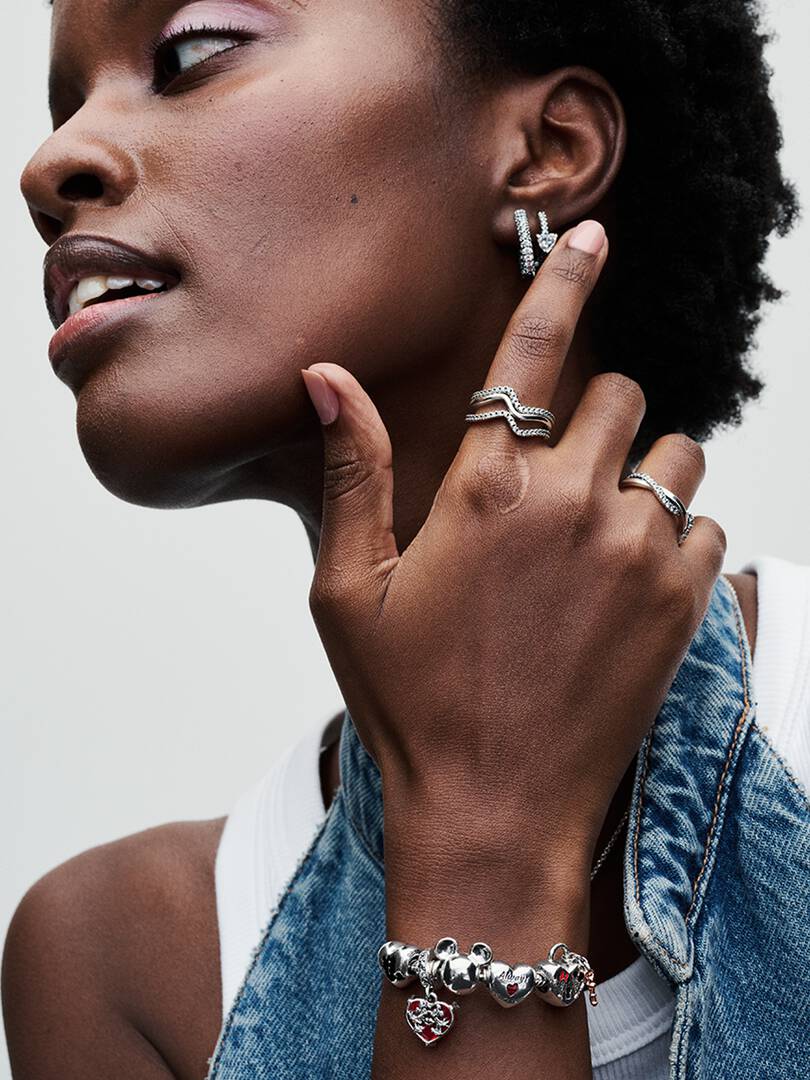 Style your Disney x Pandora charm collection on the Disney Mickey Mouse Clasp Moments Snake Chain Bracelet. This sterling silver snake chain bracelet features a clasp inspired by the iconic Mickey Mouse head silhouette. ,Press Mickey’s ears in opposite directions to easily open and close the clasp. The bracelet has two threaders (raised charm dividers) and can hold 16-18 charms or dangle charms. The perfect way to showcase your Disney favourites.