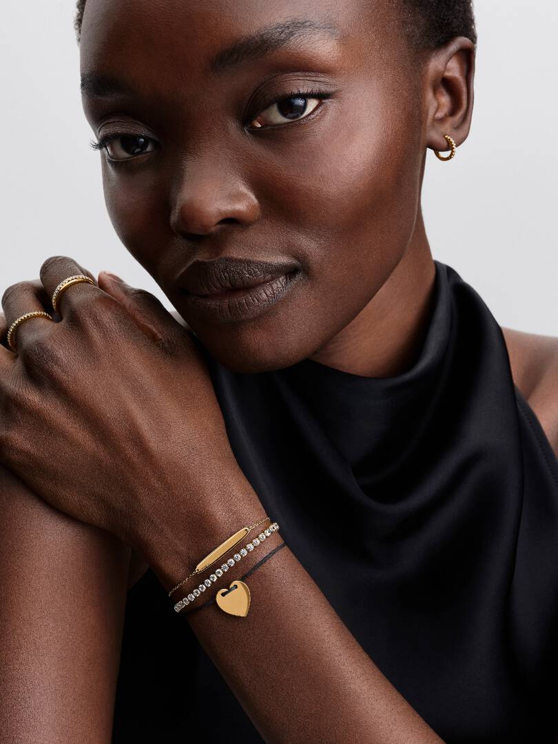 Put your love in words This black cord bracelet features an engravable heart in 14k gold plating. With a sliding clasp, it secures easily and comfortably. A gift that means more ?C for yourself or someone else.