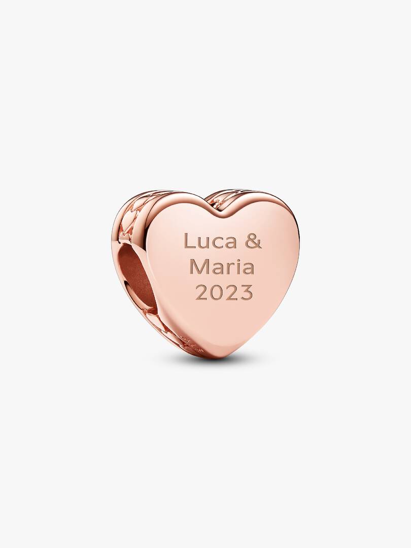 Show them the shape of your heart with the enduring symbol of love. Plated with 14k rose gold, this Engravable Heart Charm works on Pandora Moments bracelets or the Pandora O Pendant, a carrier for your favorite charms. ,This Pandora piece is all about self-expression: choose to keep it blank and let the symbol speak for itself or engrave the front, the back or both. Pandora Engraving is only available in select stores and markets.