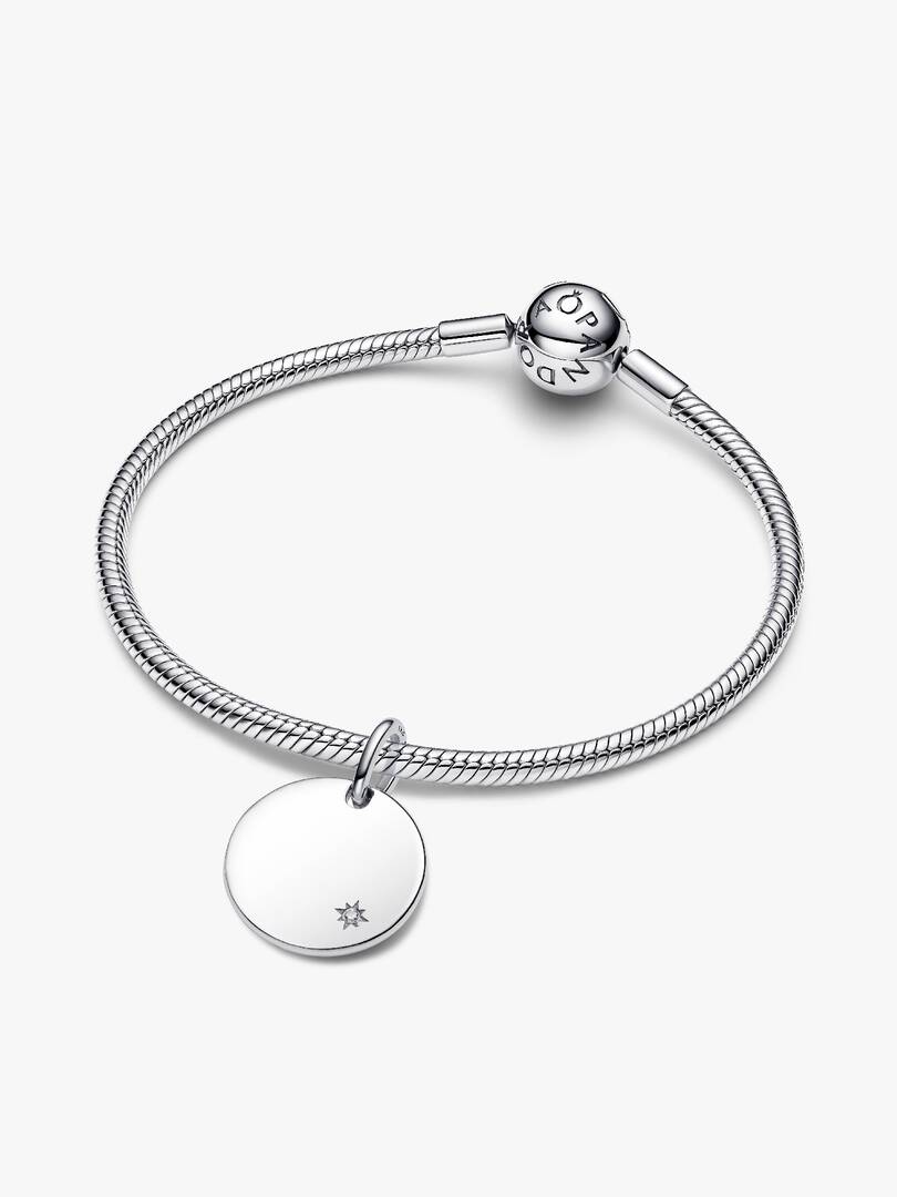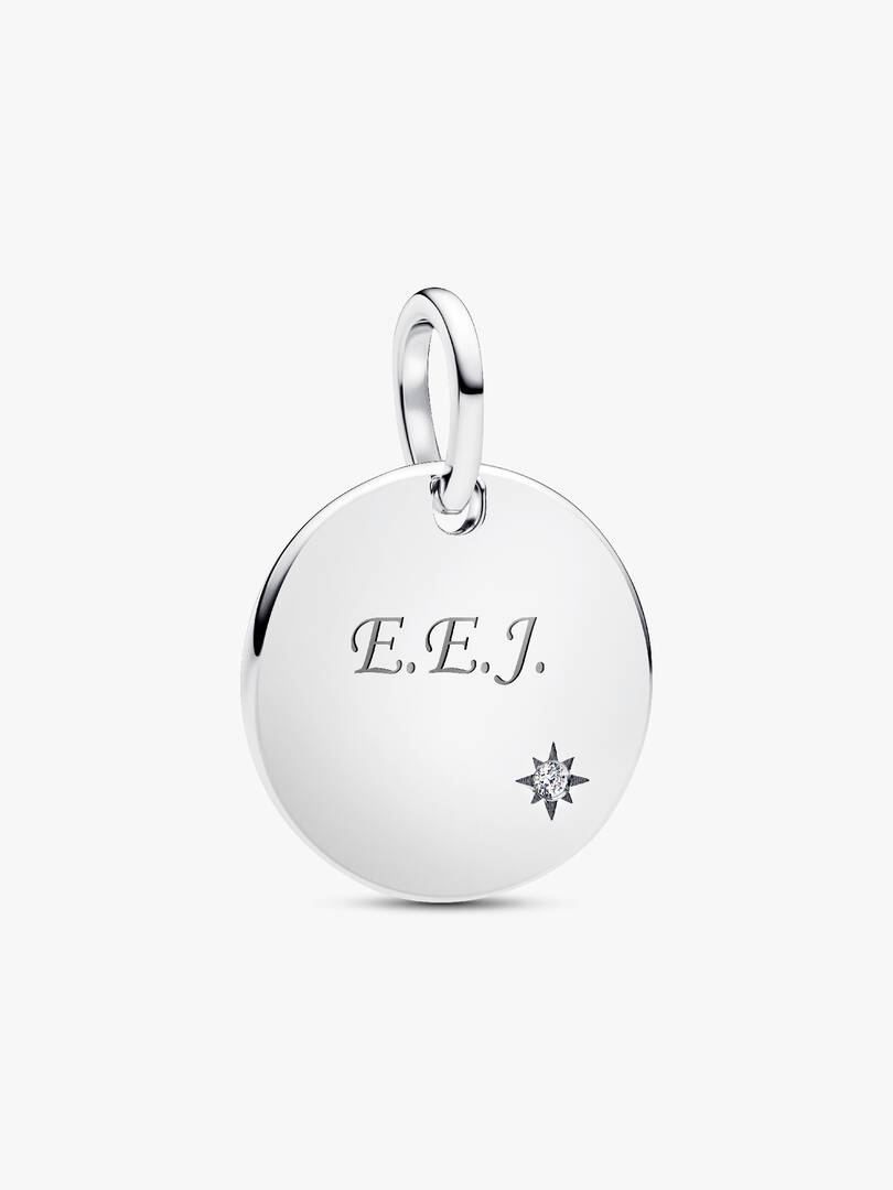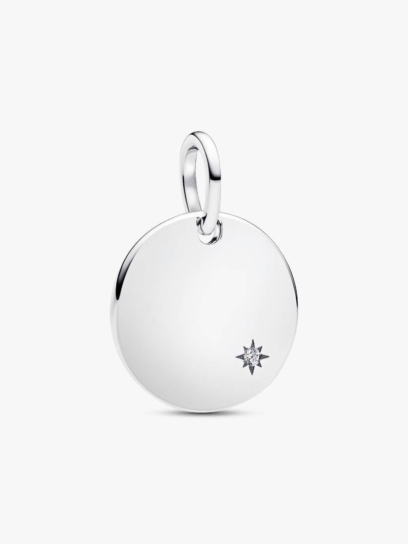 Minimalist style that makes a brilliant statement. Our sterling silver polished disc pendant features a radiant lab-grown diamond in a star-shaped setting and is ready to engrave and personalize your way.