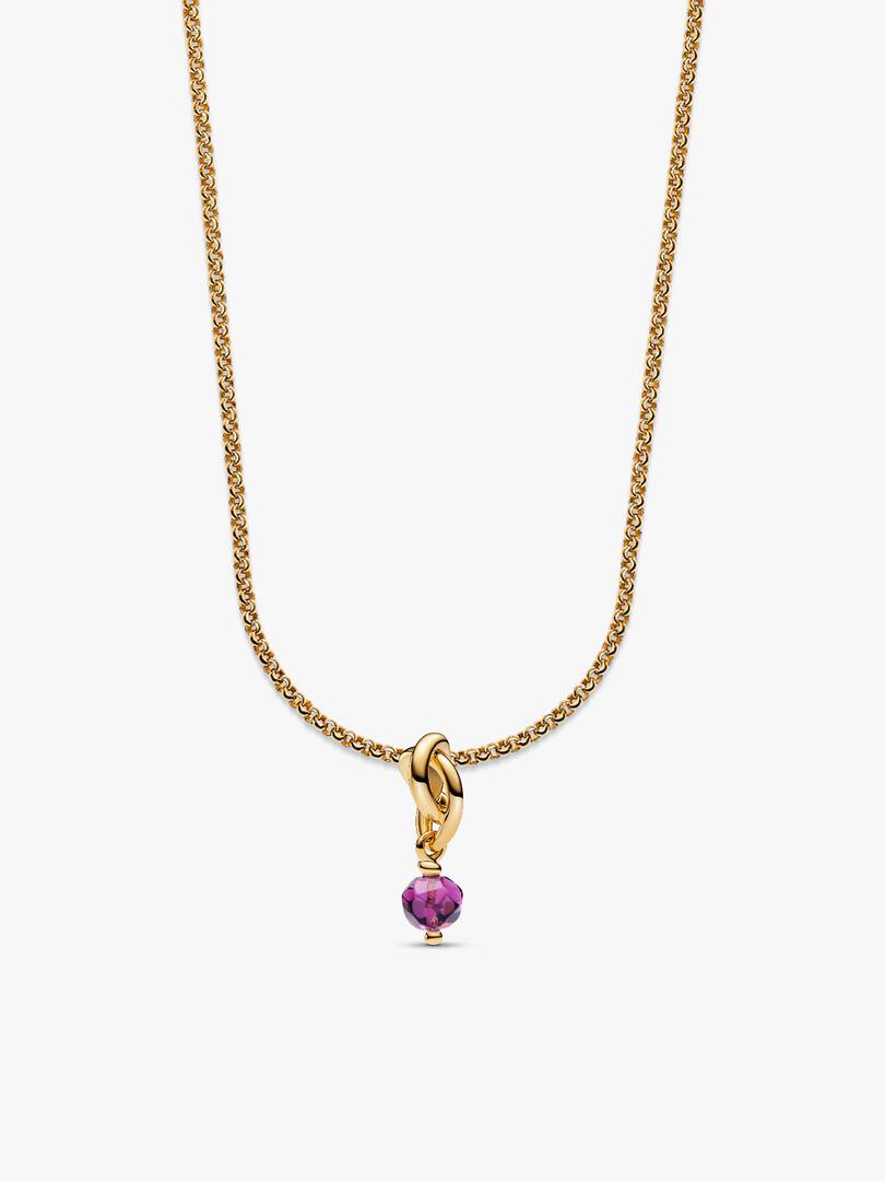 For the month of February, sweet grape purple. Inspired by the positive power each color brings, our Eternity Circle dangle charm gets a glow up in 14k gold-plating with a new faceted stone cut design and intricate tripl,e knotted circle above. With its twisted infinity motif and lovely pop of purple, February??s symbolic charm is perfectly styled on a 14k gold-plated chain necklace for a look that??s as beautiful as the birthday it celebrates.