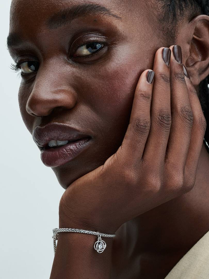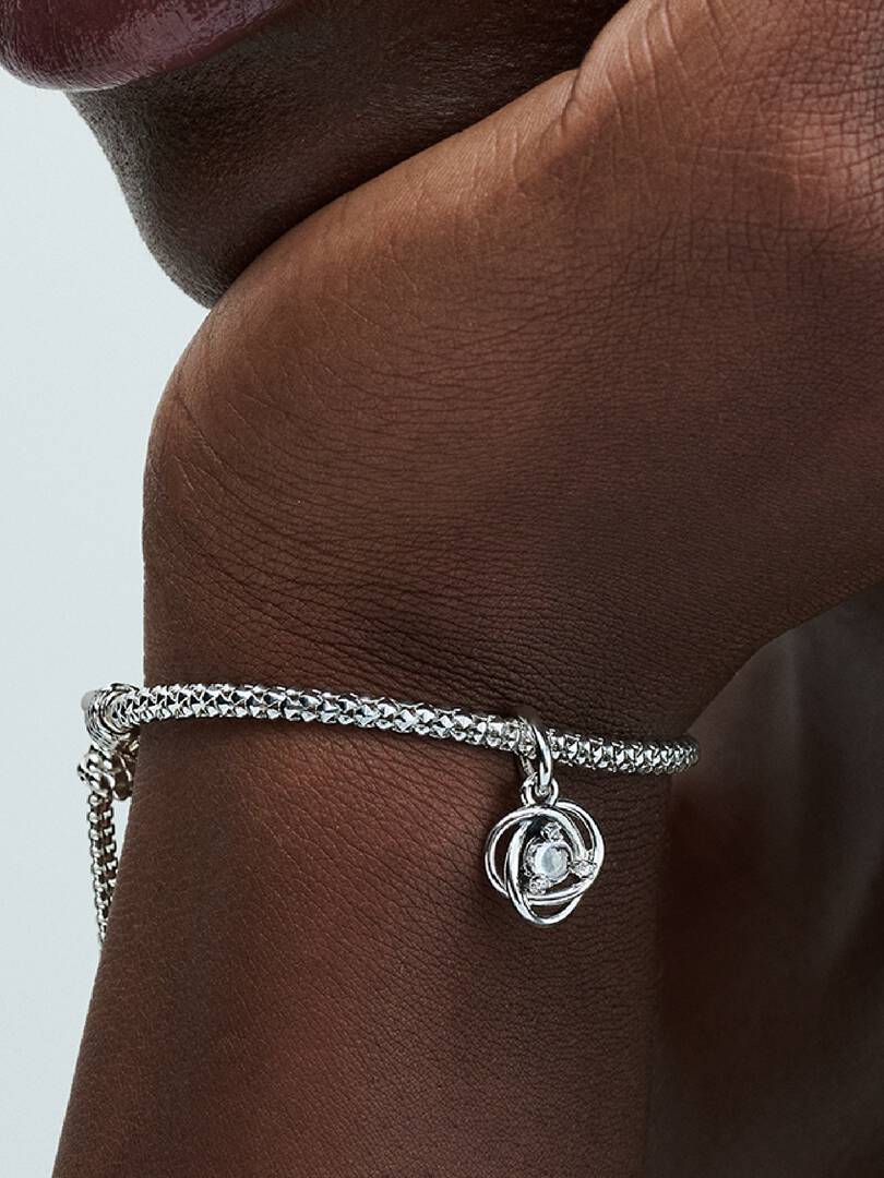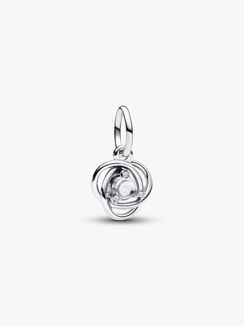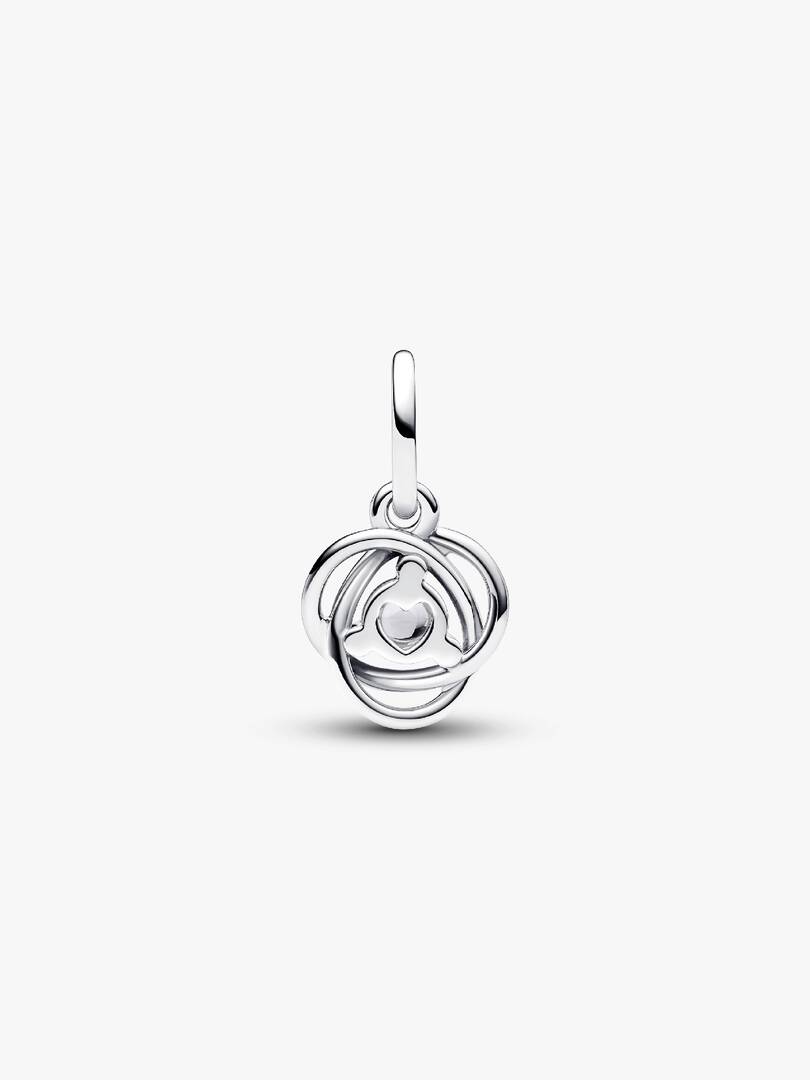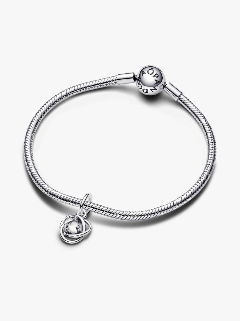 This intricate Clear Eternity Circle Dangle Charm is a must-have for your Pandora Moments collection. Crafted in lustrous sterling silver, it features an openwork infinity braid decorated with a central larger clear cubi,c zirconia, elegantly surrounded by three smaller clear cubic zirconia. The intricate design symbolizes eternity and adds an additional layer of meaning to the piece. Elevate your bracelet with this timeless piece or gift it as a representation of an everlasting bond.