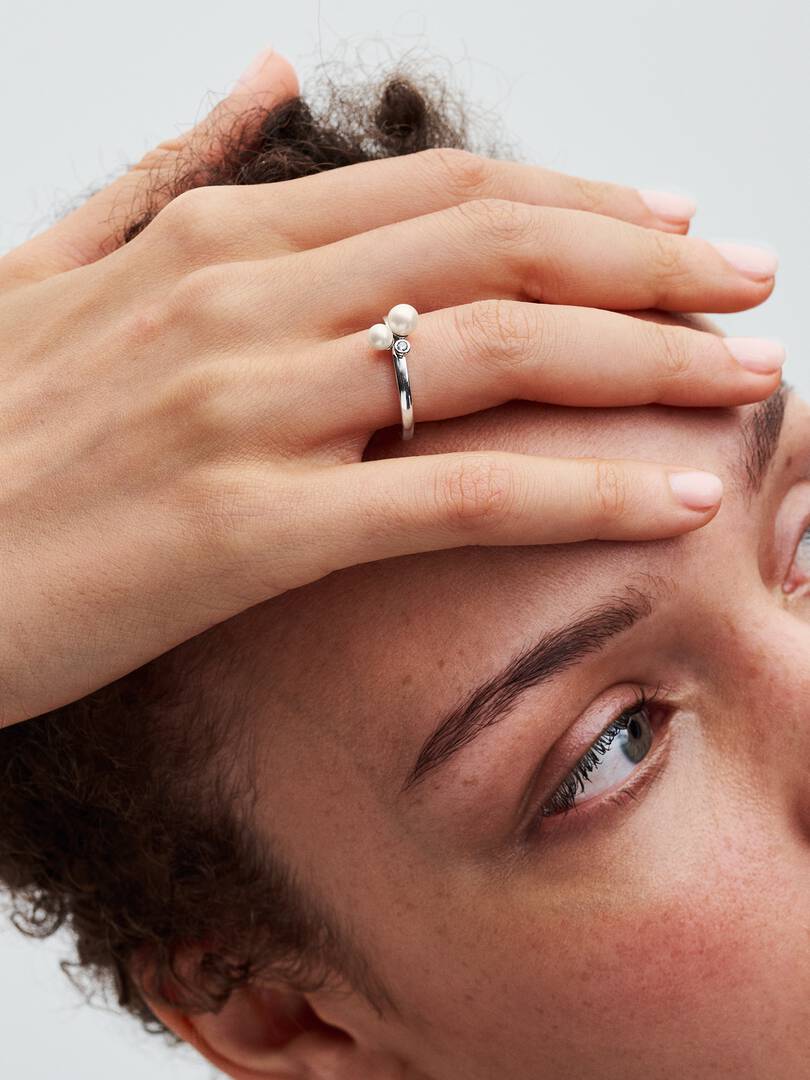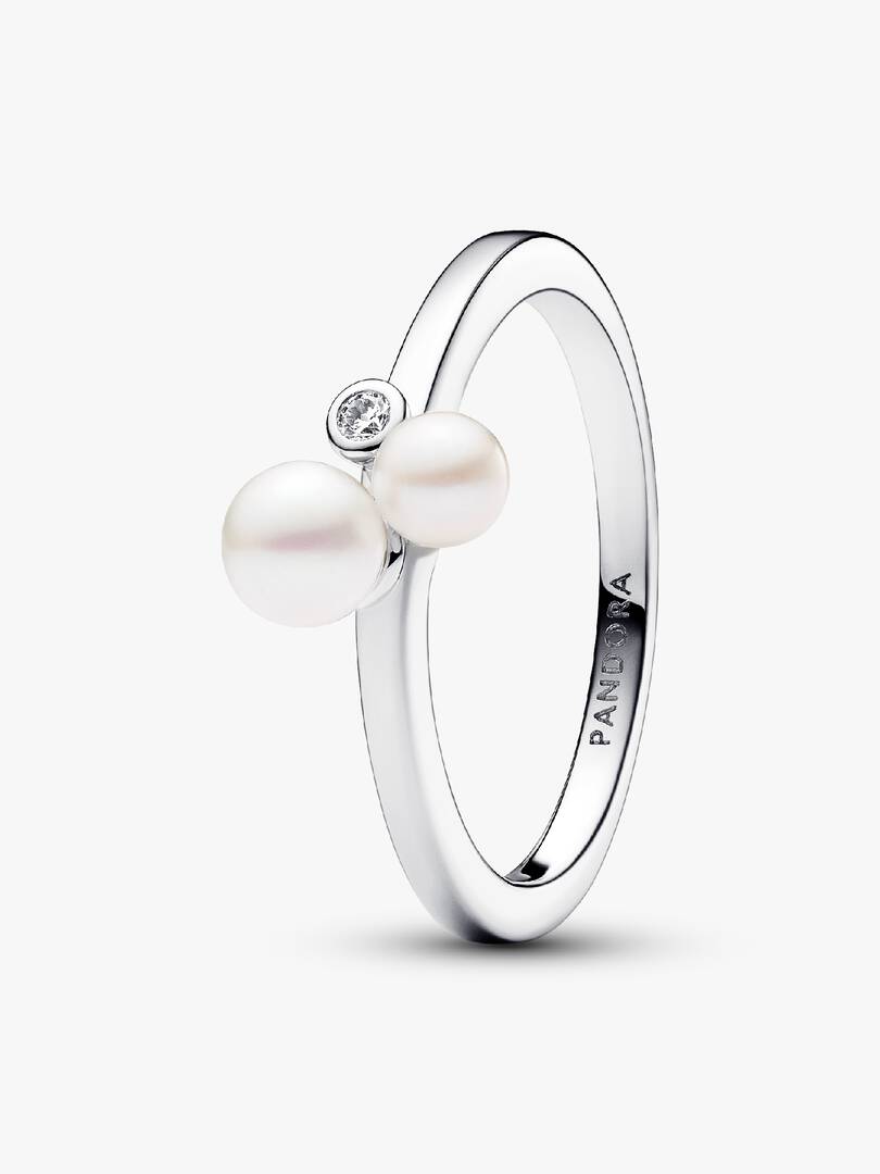 Celebrate closeness with our Duo Treated Freshwater Cultured Pearls Ring from the Pandora Timeless collection. Crafted in sterling silver, the slightly squared profile of the band showcases two asymmetrically placed trea,ted freshwater cultured pearls, accompanied by clear cubic zirconia. This unique piece, embellished with the engraved Pandora logo, captures the essence of classic pearls, symbolizing beauty, wisdom, and love. Wear it as a symbol of your unique connection. Please note each treated freshwater cultured pearl is unique and can vary in size and color; normal wear and tear may occur with this material. Our freshwater cultured pearls are treated with bleaching and luster enhancement.