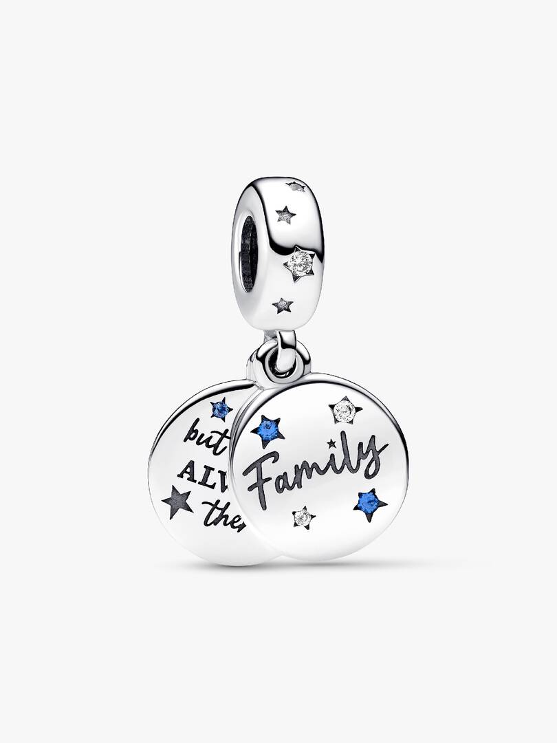 The Family Love Double Dangle Charm offers a special way to keep them close. A sterling silver charm with two discs that tell a story through engravings. Spread across the surfaces, it reads: “Family… are like STARS, y,ou don’t always see them… But they are ALWAYS there”. Finishing this dangle charm are flush-set round clear cubic zirconia and blue man-made crystals that twinkle like stars. Wear on your favorite chain and always be reminded of those you love the most.