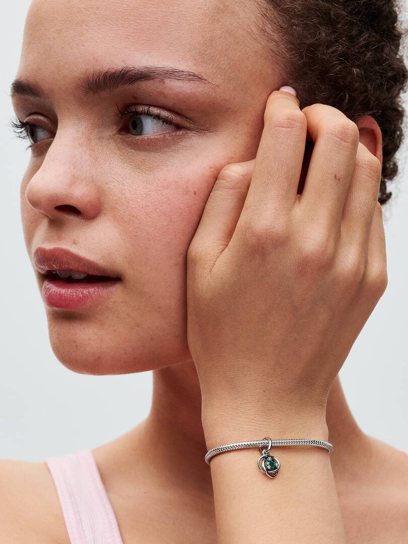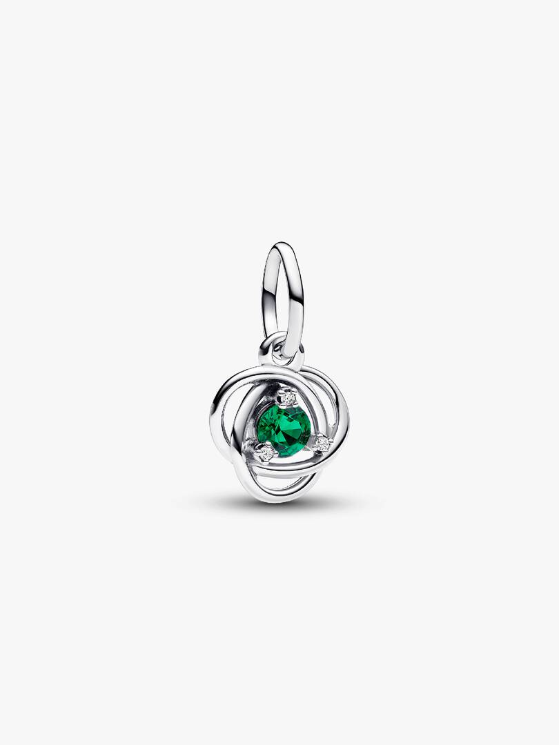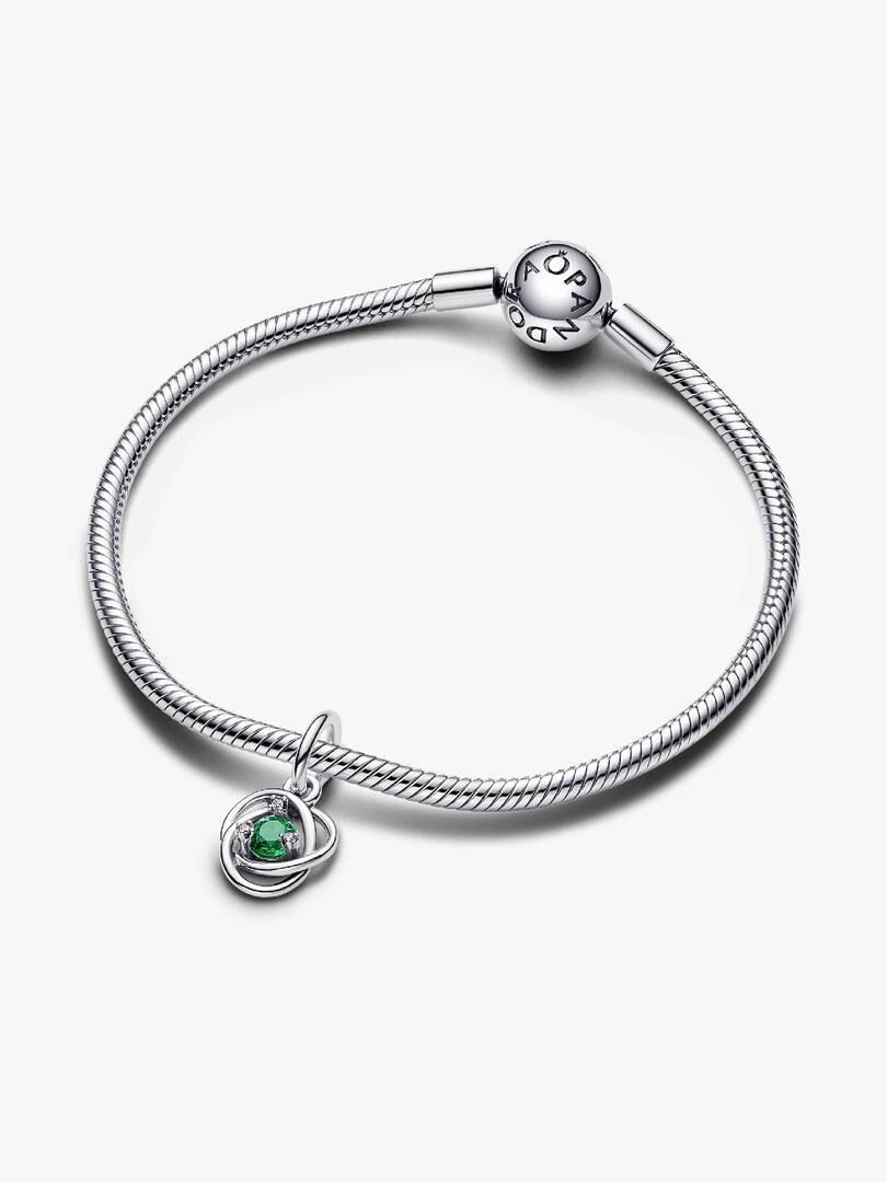 This intricate Green Eternity Circle Dangle Charm is a must-have infinity charm for your Pandora Moments collection. Crafted in lustrous sterling silver, it features an openwork infinity braid decorated with a central gr,een manmade crystal, elegantly surrounded by three clear cubic zirconia. The intricate design symbolizes eternity and adds an additional layer of meaning to the piece. Elevate your bracelet with this timeless piece or gift it as a representation of an everlasting bond.