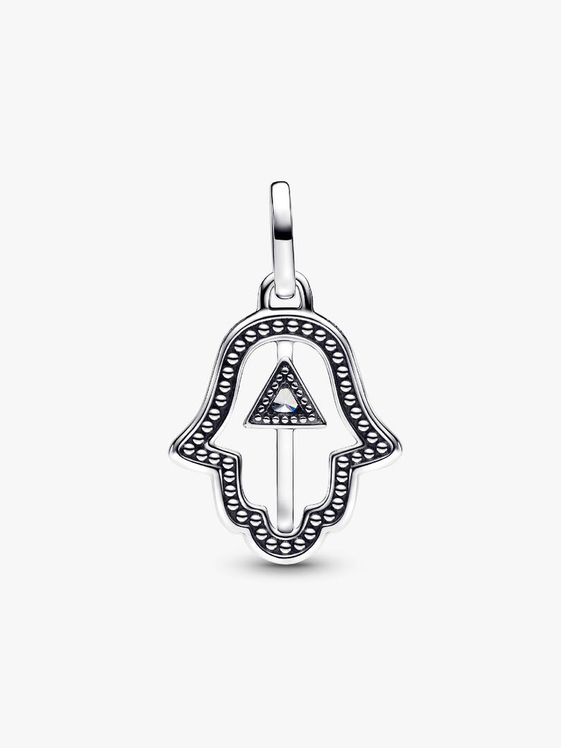 Channel positivity with our sterling silver Hamsa hand charm. Featuring a radiant stone at its center and outlined with microbeads on the back, this medallion is a mystical symbol of protection, abundance and friendship., Add it to your collection as a talisman to welcome in positive vibes and ward off negative energy.