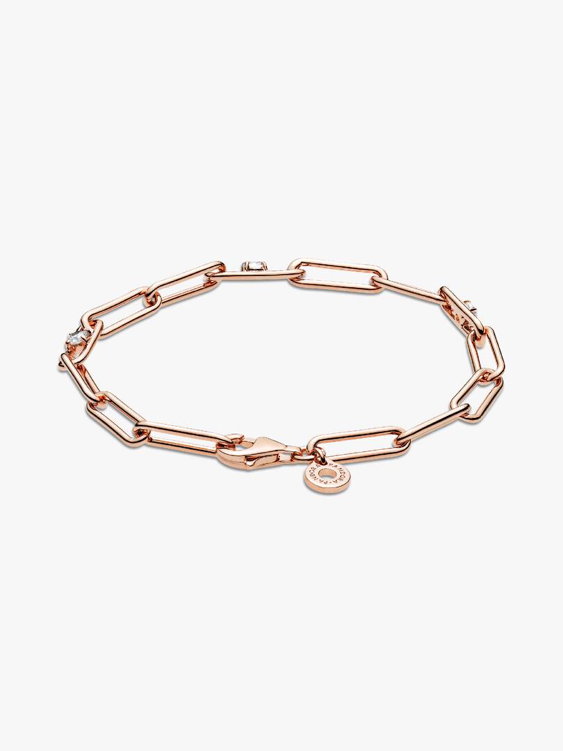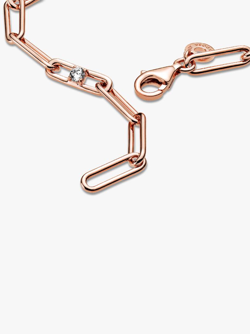 For a touch of sophistication, look to the Link Chain & Stones Bracelet. This classic, chunky design is hand-finished in 14k rose gold-plated unique metal blend. Featuring clear cubic zirconia on three of the bracelet??s ,links for added sparkle, this wrist piece includes a dangling tag on the closure link. Wear with other link chain styles for an elegant look with an edge.