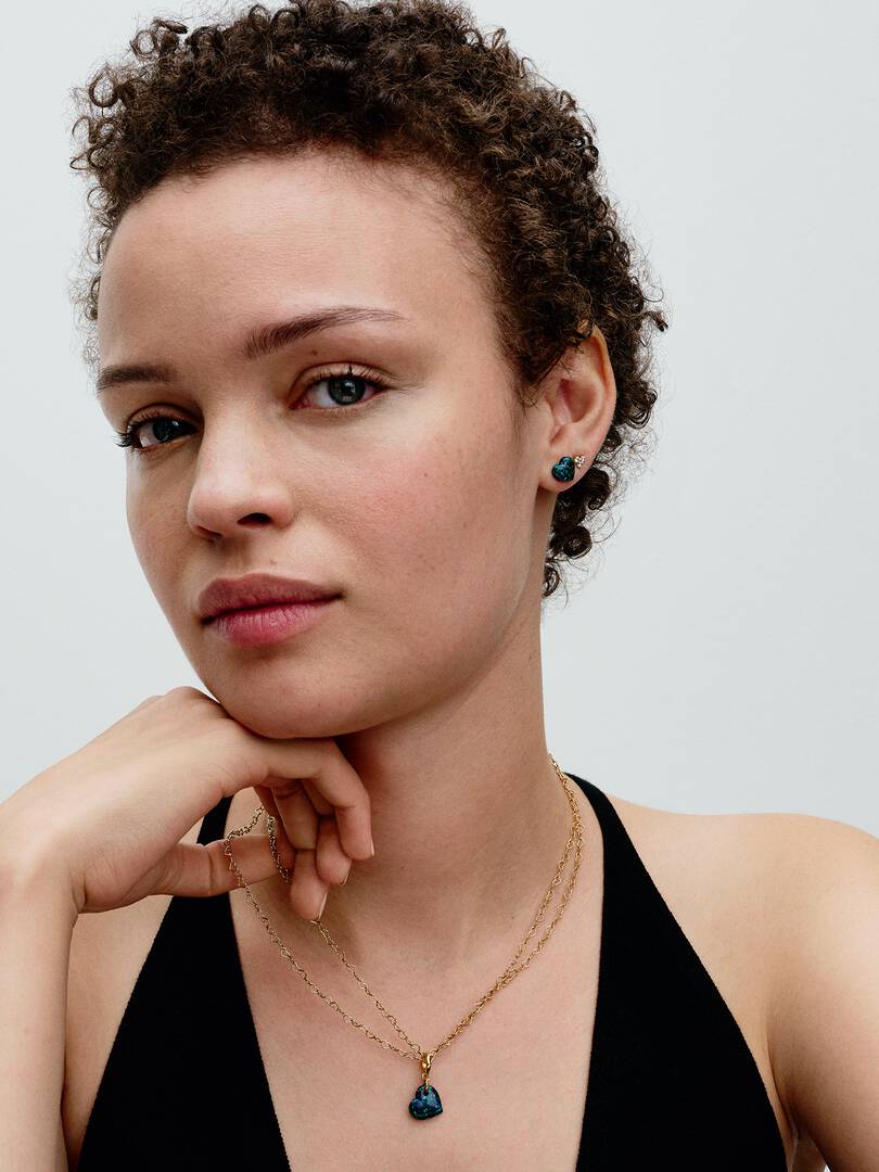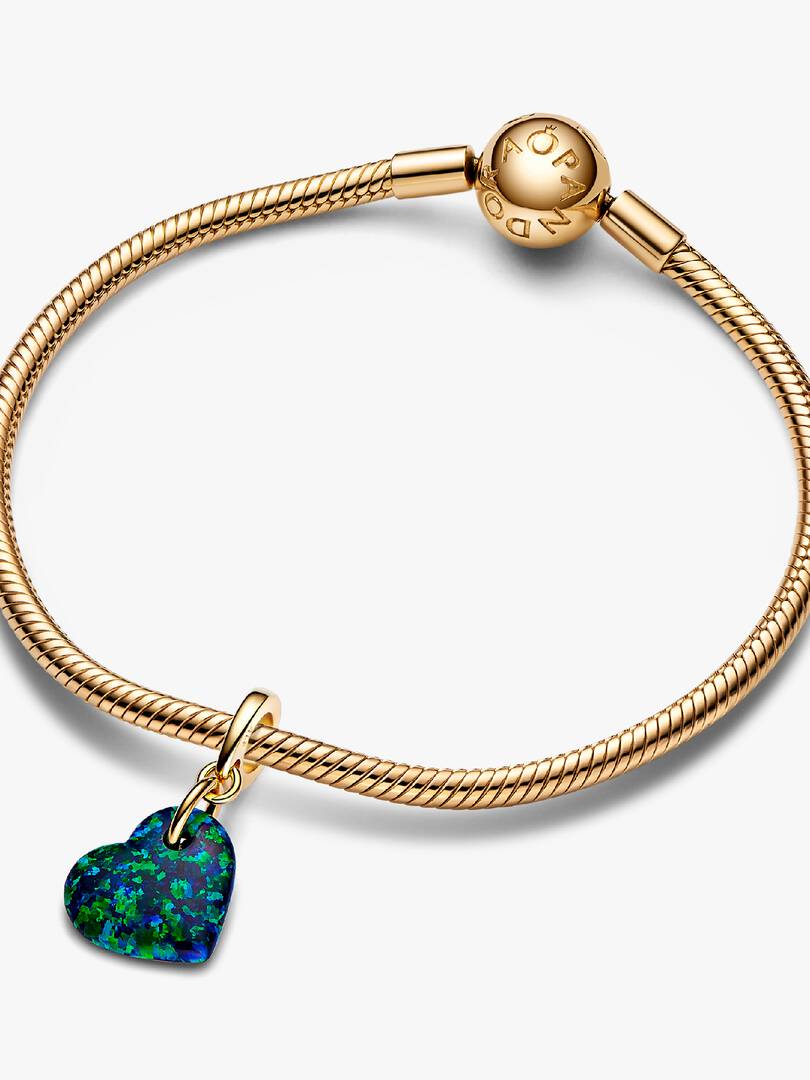 Channel the heart of the jungle with the Opalescent Green Heart Dangle Charm. A lab-created, heart-shaped iridescent opal features a spectrum of colors and streaks of glitter designed to evoke the vivid colors of the tro,pics. The heart hangs from an angle from a 14k gold-plated jump ring and pear-shaped bail. Pair this vibrant charm with other warm-toned styles to create a rich focal point and remind yourself of the wild, free-spirited energy of nature and summer.