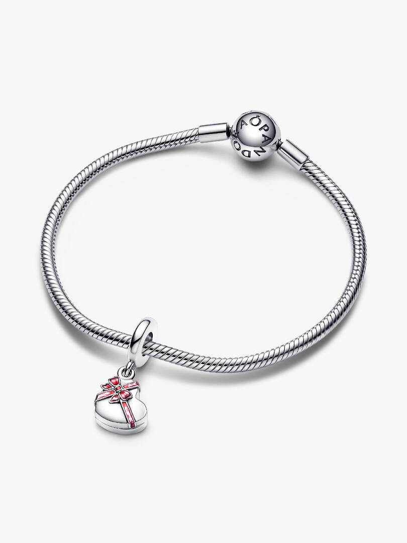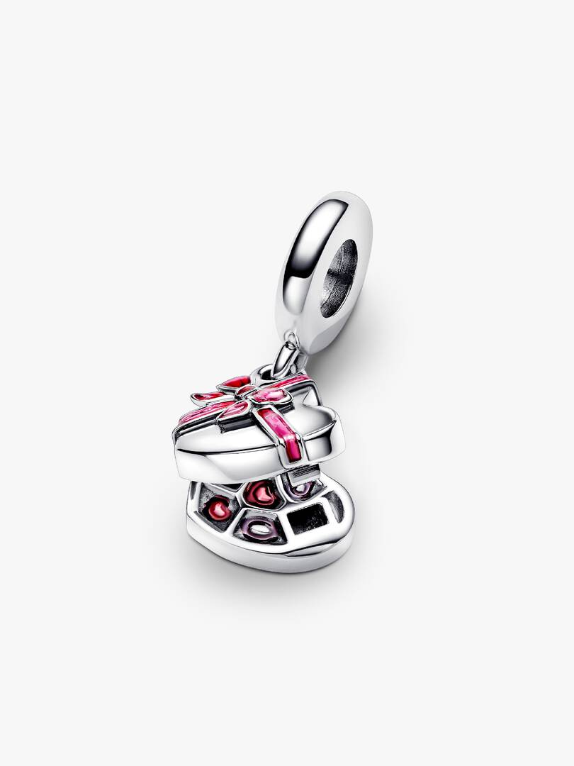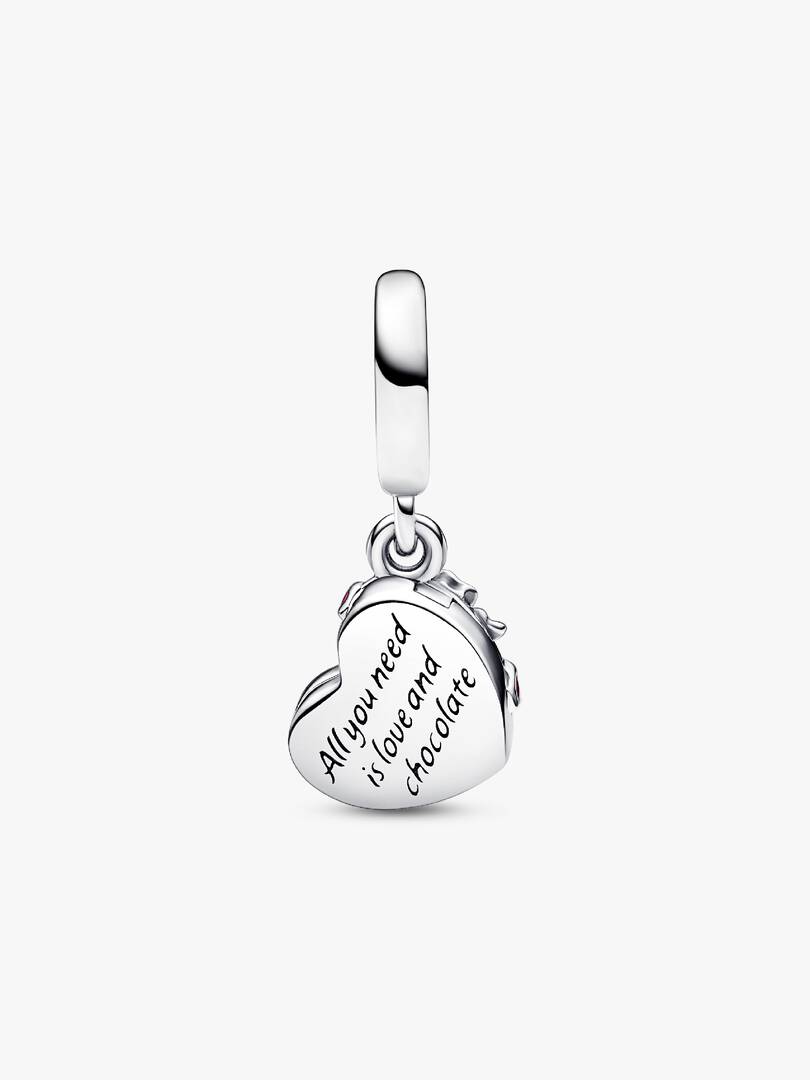 Celebrate the sweetest things in life with the Openable Heart Chocolate Gift Box Dangle Charm. This sterling silver dangle charm take the shape of an openable heart-shaped box of chocolates tied with a bright enamelled b,ow. Open the box and you’ll see a selection of delicious-looking chocolates with red and purple enamel wrapping. The back of the box is engraved with “All you need is love and chocolate.” A sweet treat for the one you love.