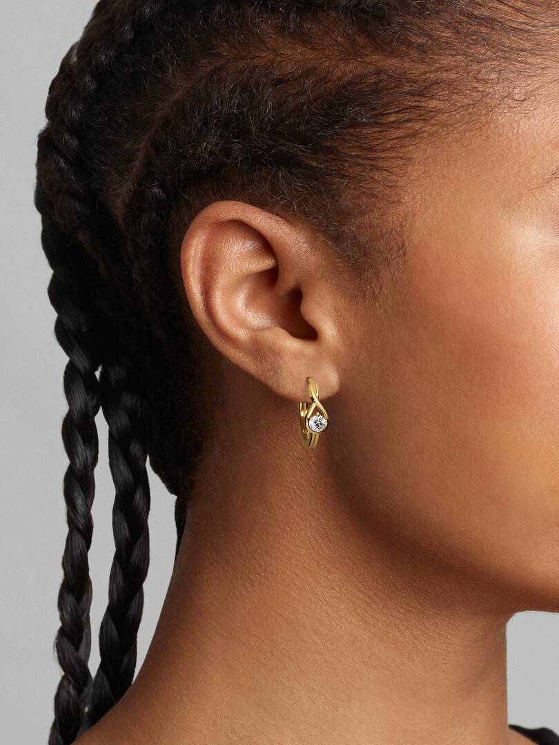 A pair of solid 14k gold hoop earrings each hand-set with a 0.25 carat lab-grown diamond. As a pair this equates to 0.50 carat total weight. A symbol of empowerment, evolution and possibility. Each earring showcases a fi,ery round brilliant excellent cut lab-grown diamond in a modern infinity setting that flows seamlessly around the stone and continues into an elegant hoop. For paired earrings, an accompanying certificate warrants the size and quality of each individual stone. Each Pandora Lab-grown diamond is treated with a post-growth color enhancement called annealing.