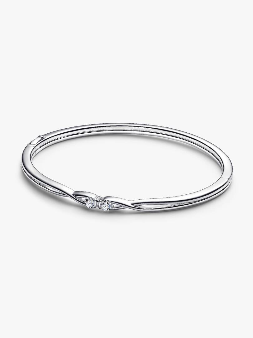 Infinite design, infinite styling possibilities. Our Pandora Infinite bangle is crafted in sterling silver, with two 0.15ct lab-grown diamonds that meet its centre. Set in our unique interpretation of an infinity symbol,, the diamonds face each other and appear to float, allowing maximum light to pass through. With a hinge closure, this radiant bangle makes an unforgettable gift and a precious addition to any collection. To ensure our rigorous standards of quality in colour and clarity, each lab-grown diamond has undergone an additional high heat and pressure treatment prior to cutting and polishing.