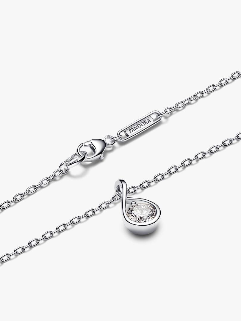 A solid sterling silver pendant hand set with a 0.50 carat lab-grown diamond on a matching sterling silver necklace. A powerful reminder of all we are, all we can be, and the infinite possibility the future holds. This p,endant features a fiery round brilliant excellent cut lab-grown diamond in a modern infinity setting that flows around the stone and suspends it in mid-air. The chain is easily adjustable to two lengths. Pandora Infinite lab-grown diamonds at and above 0.50 carat are certified by IGI. Each Pandora Lab-grown diamond is treated with a post-growth color enhancement called annealing.