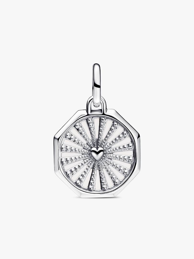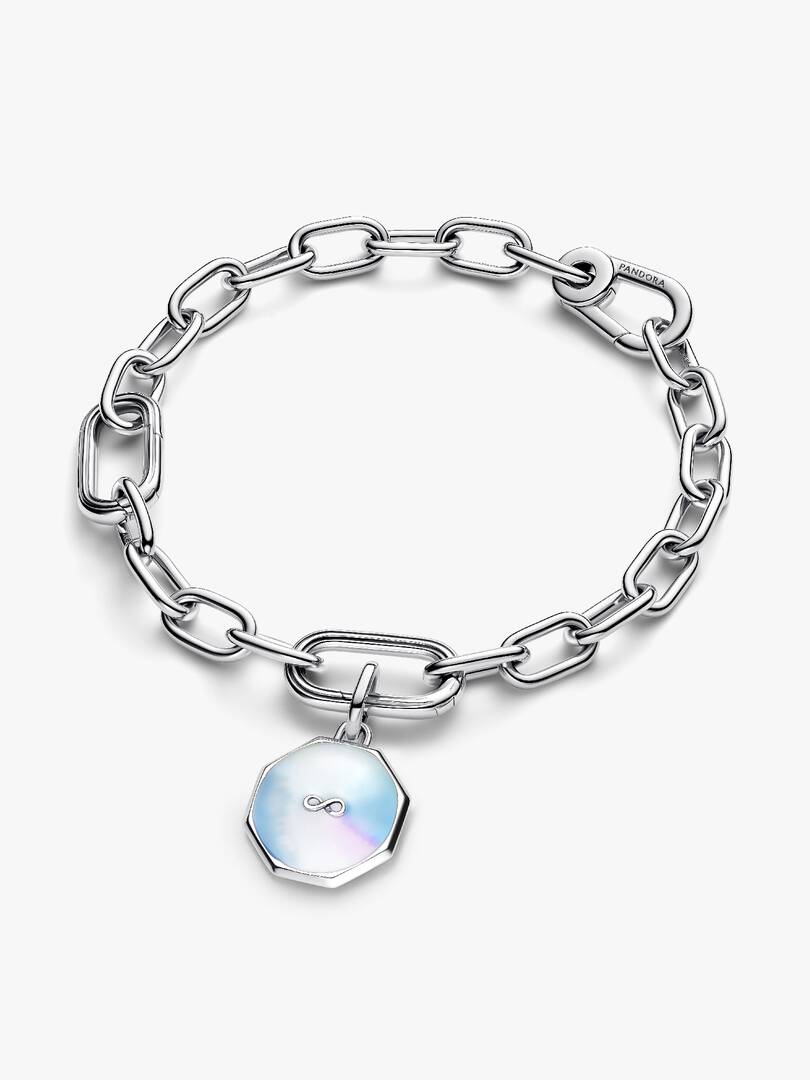 With the Pandora ME Infinity Medallion Charm, the possibilities are endless. An octagon-shaped sterling silver disc features a raised infinity sign surrounded by tie dye?Cinspired multicolored enamel. On the reverse side,, cut-out rays with microbead details surround a raised heart at center. Stack this infinity charm with other symbolic styles for a maximalist look with personal meaning, or wear it solo on a carrier for a sleek, pared-down effect. Can only be styled on openable links.