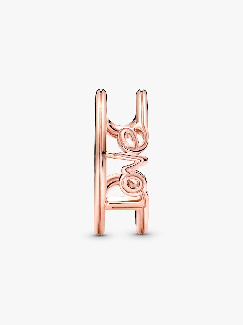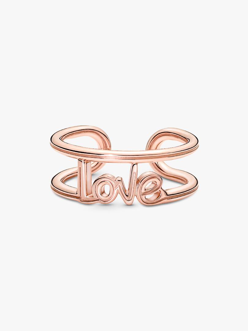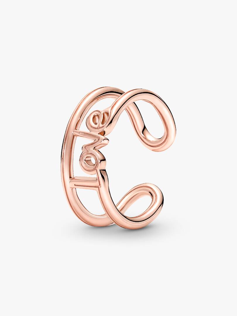 Wear your love loud and proud everywhere you go with this Pandora ME Love Open Ring. Hand-finished, this 14k rose gold-plated link is emblazoned with the word ??love?? in a handwritten font on a continuous line design that, leads into the ring band. Style yours to represent the love for your family, your best friends, or your love for yourself. Add significance to your looks by adding this statement ring into your everyday stacks. Please note: attempting to reshape the open band yourself will damage your ring.