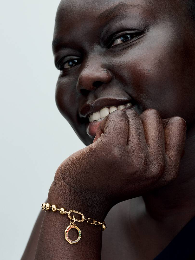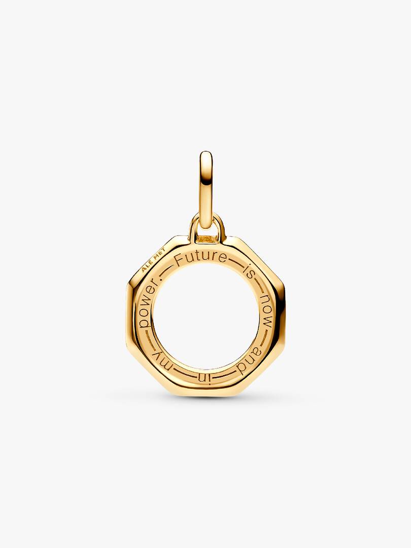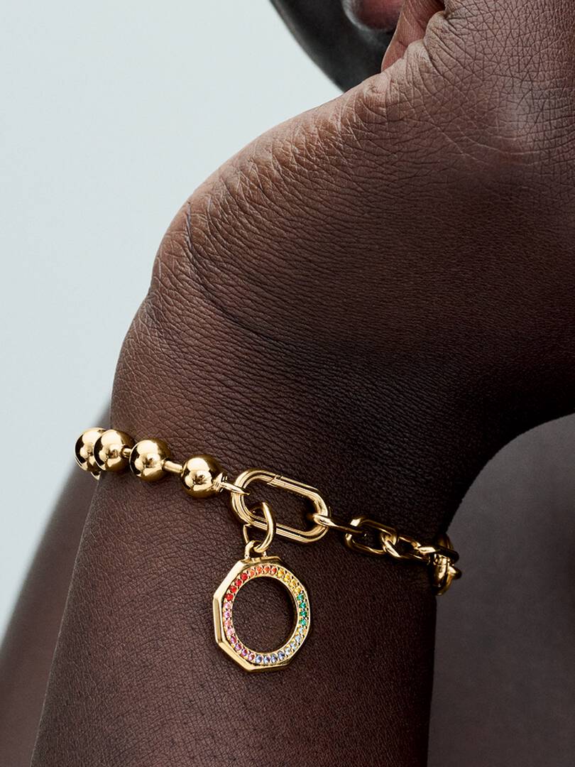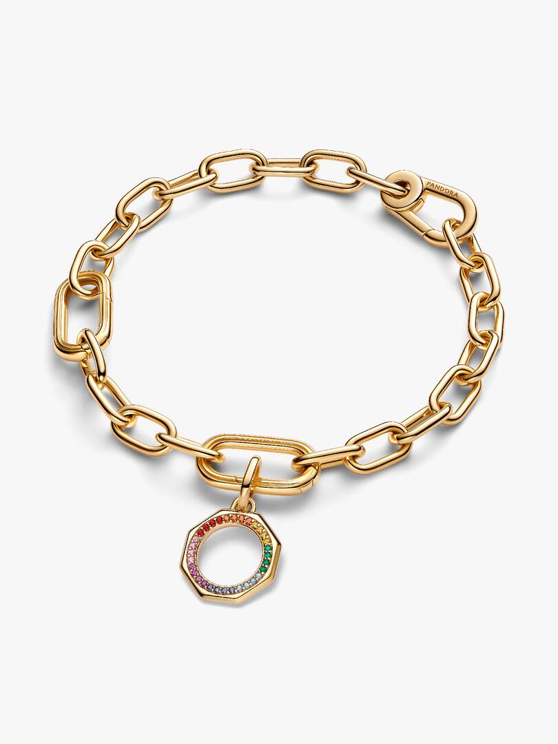 Energize your look and your vibe with the Pandora ME Rainbow Medallion Charm. Crafted in our 14k gold-plated unique metal blend, this octagon-shaped charm features a rainbow-hued row of sparkling stones in green, pink, l,ight blue, dark blue, red, purple, orange and yellow on one side. On the other side is an engraved message that reads: “The future is now and in my power.” Wear this piece as a symbol of positive self-expression. Can only be styled on openable links.
