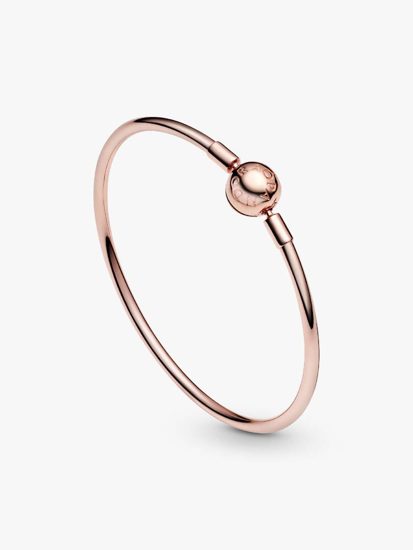 The simple things in life often are the greatest gifts. Like this minimalist Pandora Moments Bangle, carefully plated with 14k rose gold. The sleek style is stamped on the ball clasp with our logo ?C a subtle way to chann,el the trend. Adding polished edge to any look, try using silicone-lined clips to space out charms or dare to bare and wear it solo.