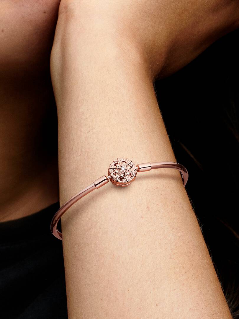 FINAL SALE – Pandora Moments Sparkling Snowflake Clasp Bangle 14k rose gold plating