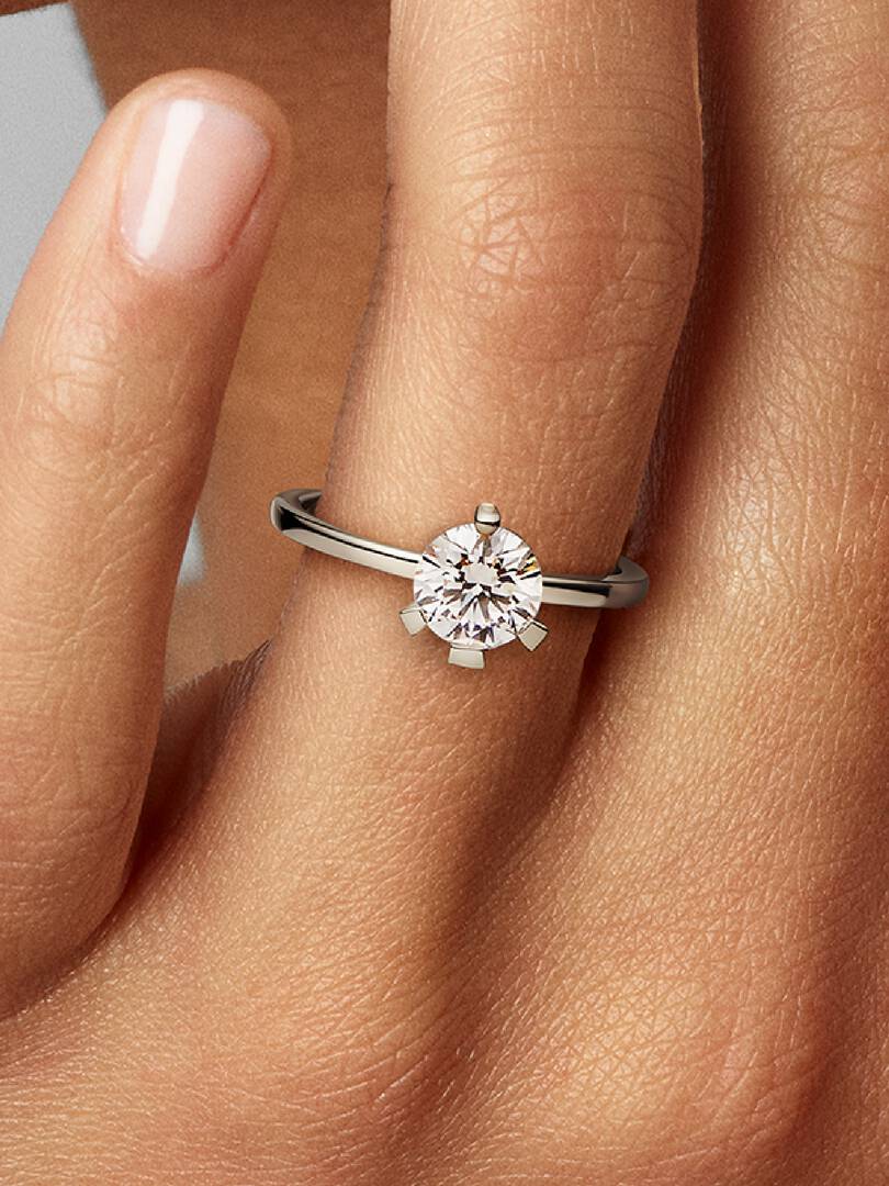 Shine in the Pandora Nova 14k White Gold Lab-grown Diamond Ring. Inspired by the illusion of capturing and holding a precious fragment of light, this 14k white gold ring showcases a 1.00 carat round brilliant excellent c,ut lab-grown diamond. The unique asymmetric prong setting opens the stone to the light for ultimate sparkle. A symbol of the unique light within all of us, this eye-catching lab-grown diamond ring is a piece to be worn and treasured for years to come – by you or someone who brings light into your world. Each Pandora Lab-grown diamond is treated with a post-growth color enhancement called annealing.