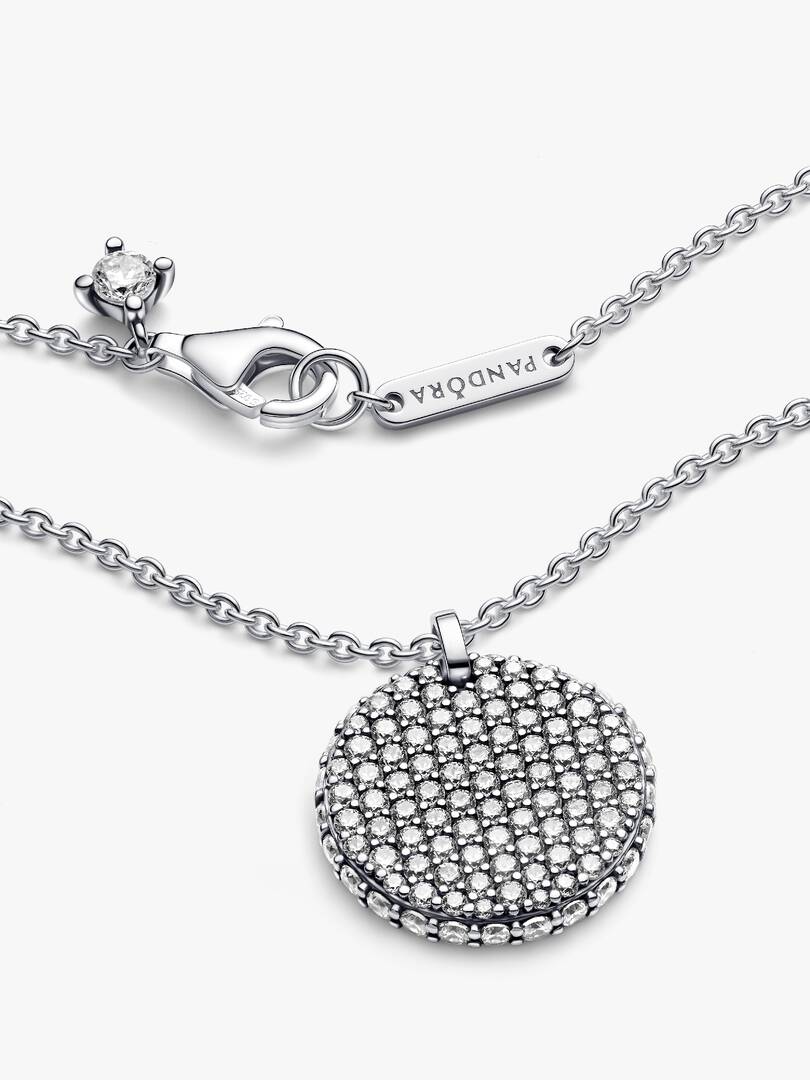 Let your sparkle do the talking with our Pandora Timeless Pav?? Round Pendant Necklace. Featuring a medallion-inspired disc covered with 89 clear cubic zirconia, this sterling silver necklace is perfect for all those that, love to shine bright. All of the stones face outward and even the edge of the medallion is encrusted for a three-dimensional effect. The back of the disc features an engraving of the Pandora logo. Let your love for sparkle shine with this unique piece or gift it to the person that lights up your life.