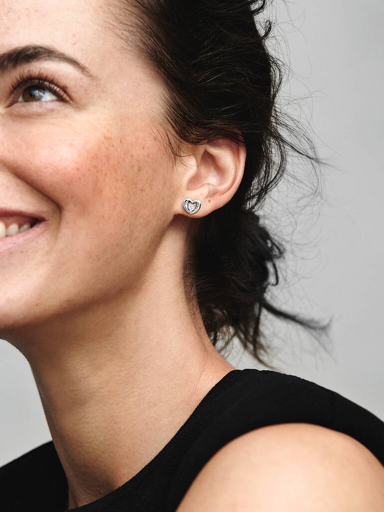 What the heart wants. Inspired by the joining of two hands to form a heart gesture, our Radiant Heart & Floating Stone Stud Earrings make a sweet statement about the power of love. Hand-finished in sterling silver, each ,3D open heart is set with a heart-shaped clear cubic zirconia at its centre. Gift them to the one who completes you.