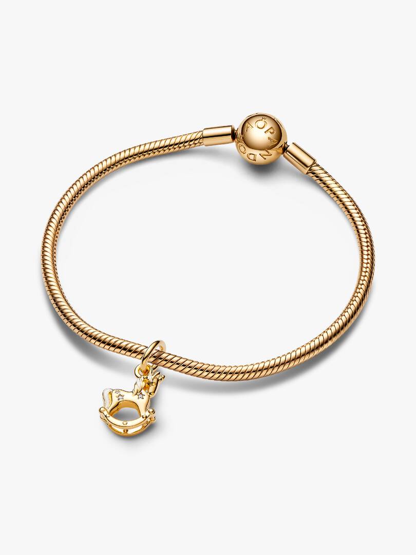 Let the holiday fun begin with the Rocking Unicorn Dangle Charm. Embrace the nostalgia of bygone festive days with a rocking horse ?C or rather, a rocking unicorn ?C inspired by a merry vintage playroom. This unicorn charm, is bejewelled with sparkling stones and has snowy white enamel details on its mane to capture the beauty of a winter wonderland. The body of the unicorn also has round cubic zirconia stones set in star shapes. This 14k gold-plated charm brings a dash of festive spirit to all your holiday looks.
