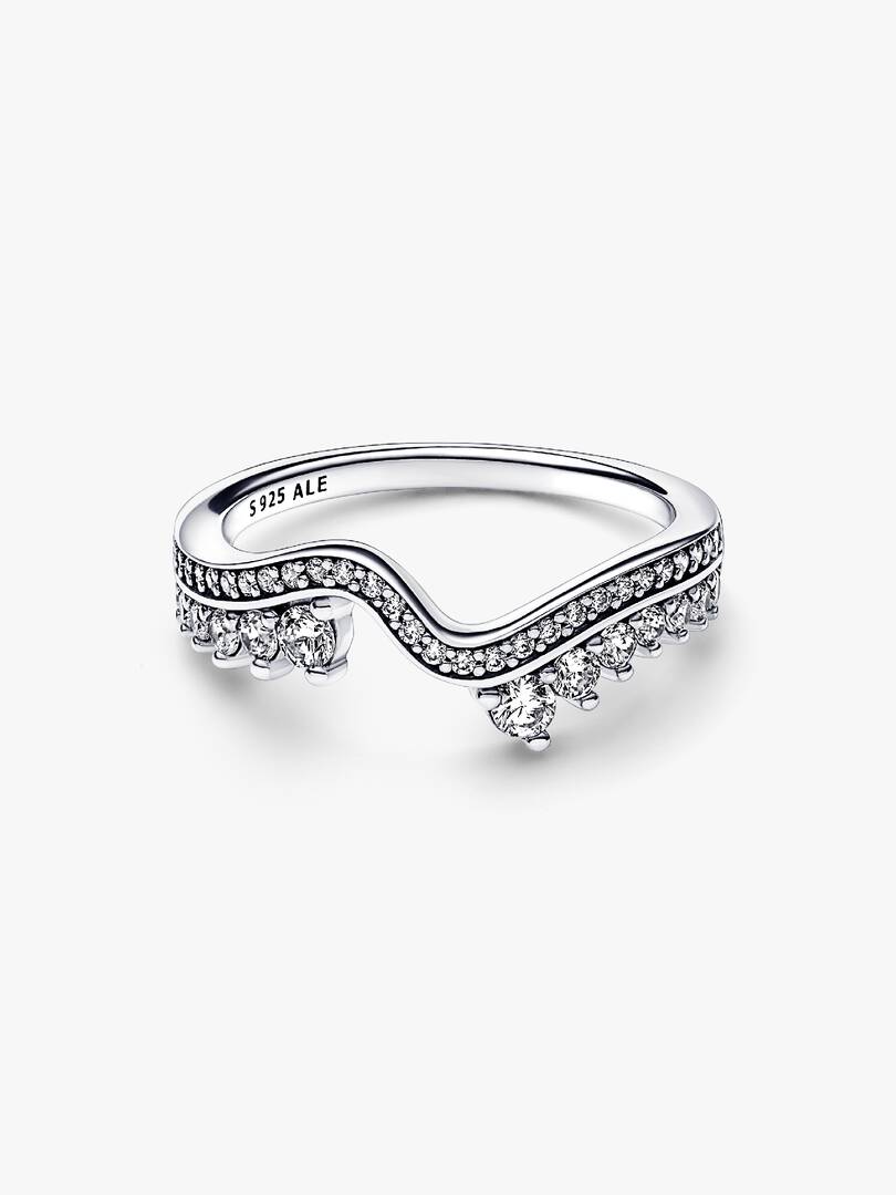 Hand-finished in sterling silver, our Sparkling Asymmetric Wave Ring features a wave-inspired pav?? band accented with a split row of prong-set stones along one side. Descending in size, the stones create a ripple effect ,that looks elegant on its own or stacked with another Sparkling Wave Ring.