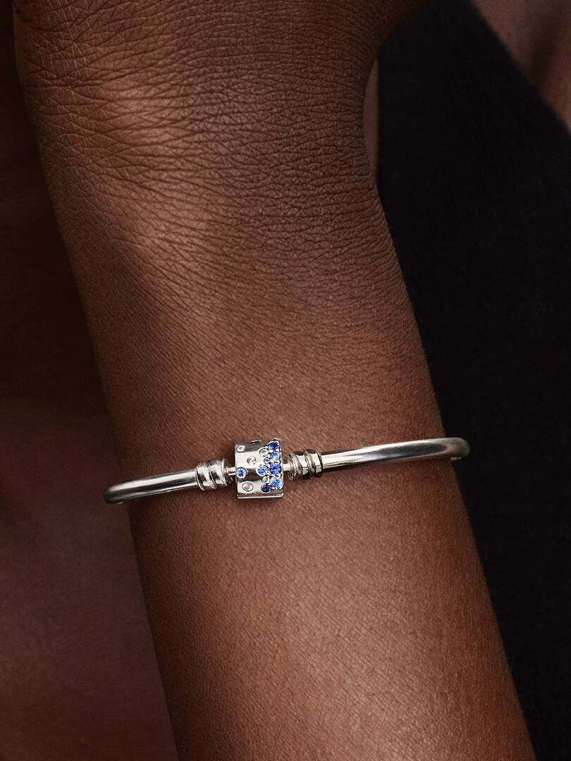 Have your moment. Our sterling silver bangle is set with blue man-made crystals and clear and blue cubic zirconia up into the clasp. An elegant piece you??ll reach for over and over again.