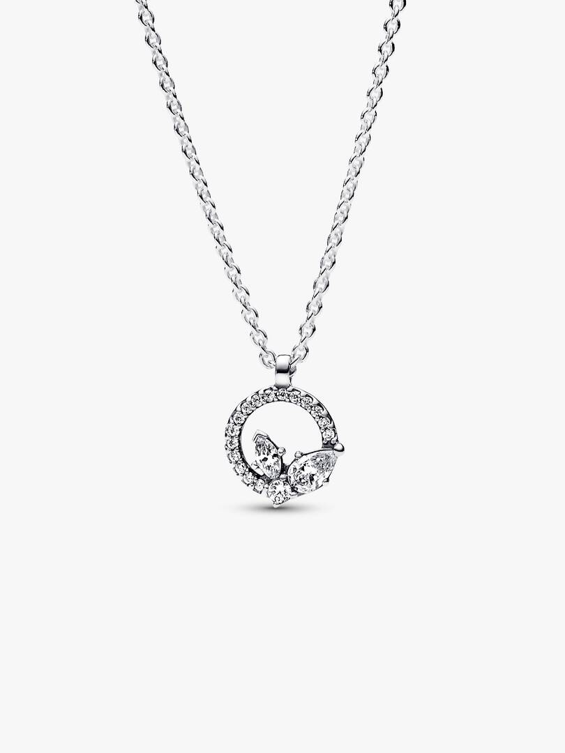 Make them look twice with our Sparkling Herbarium Circle & Cluster Pendant Necklace. Made in sterling silver, this unique piece is inspired by the natural shapes of pressed petals and leaves. The pendant features an open,work circle with a cluster of stones on the lower half in marquise and pear shapes, with a round stone sparkling at the center. Adjustable to two lengths, this elegant necklace is a reminder of the beauty of nature and its ability to surprise and delight. Wear as a stand-out piece on its own or pair with other nature-inspired sparkle for a bold look.