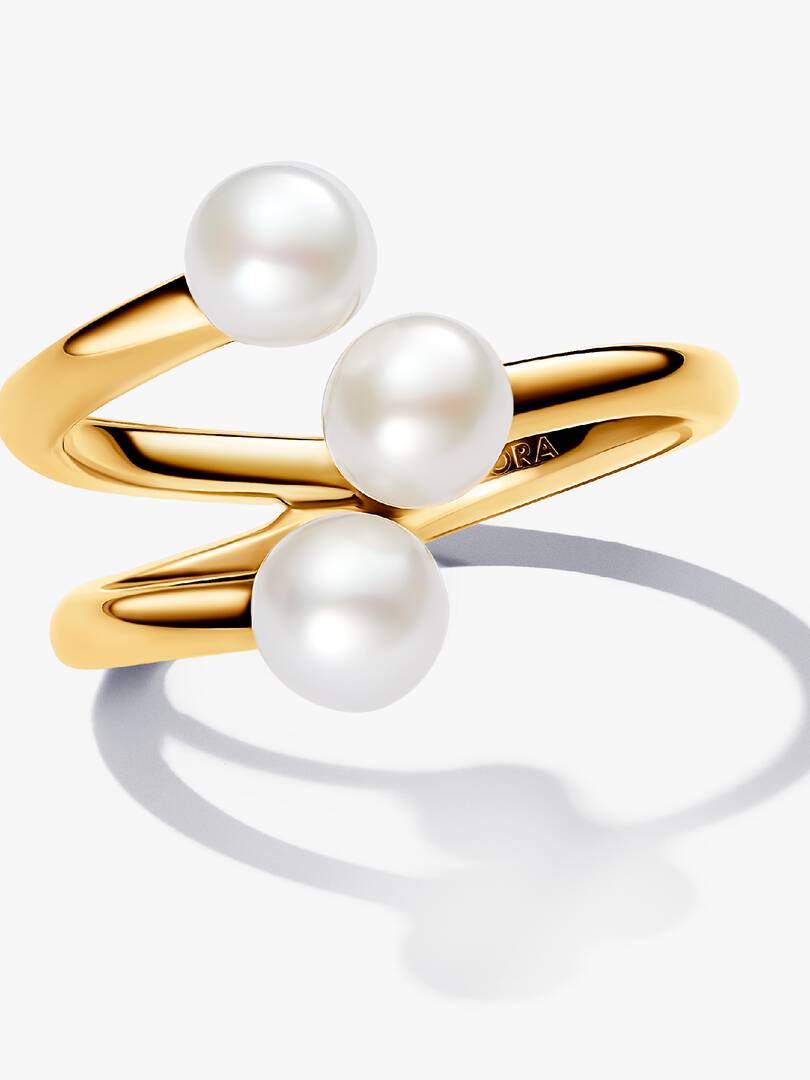 The Treated Freshwater Cultured Pearl Open Ring puts a fresh twist on a classic style. This 14k gold-plated ring splits into three separate bands with a treated freshwater cultured pearl at the end of each band. The ring, is not adjustable for size and should not be opened, bent or squeezed. Each treated freshwater cultured pearl is unique and can vary in size and color; normal wear and tear may occur with this material. Our freshwater cultured pearls are treated with bleaching and luster enhancement.
