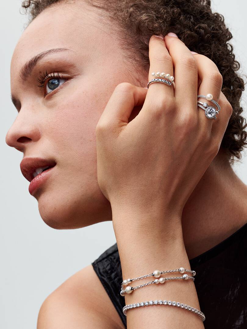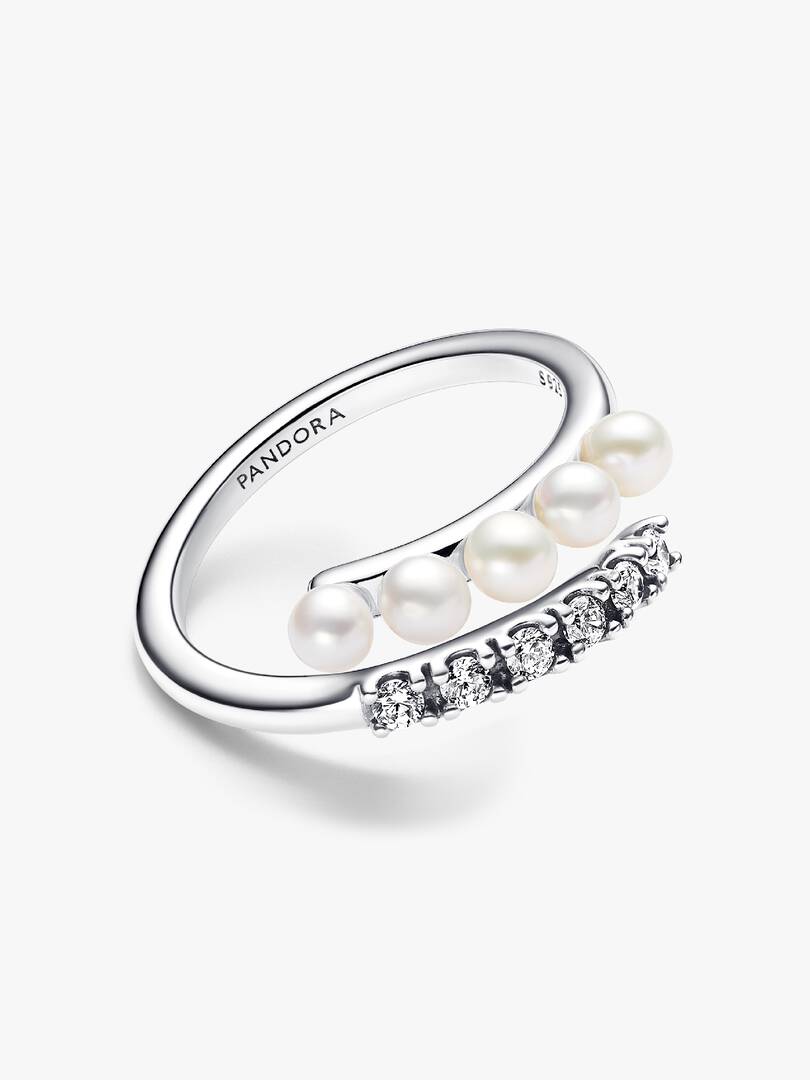 Elevate your outfit with our Treated Freshwater Cultured Pearls & Pav?? Open Ring in sterling silver. A chic fusion of elegance and modern open design, this unique ring features a row of lustrous pearls on one end and a p,av?? of sparkling stones on the other. The Pandora logo discreetly engraved inside adds a touch of authenticity. Inspired by the timeless allure of pearls and the play of textures, this ring is a statement piece. Please consider that this ring is not size adjustable and any attempt to open, bend of squeeze it may result in damage. Please note each treated freshwater cultured pearl is unique and can vary in size and color; normal wear and tear may occur with this material. Our freshwater cultured pearls are treated with bleaching and luster enhancement.