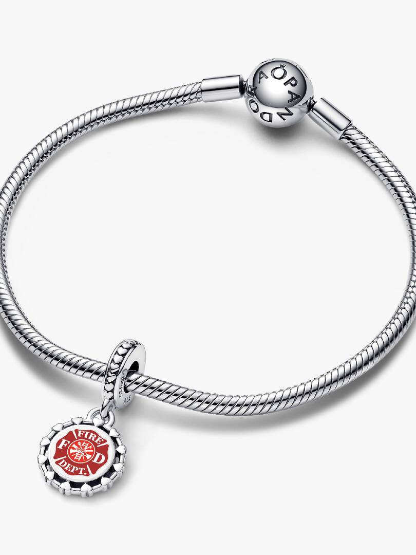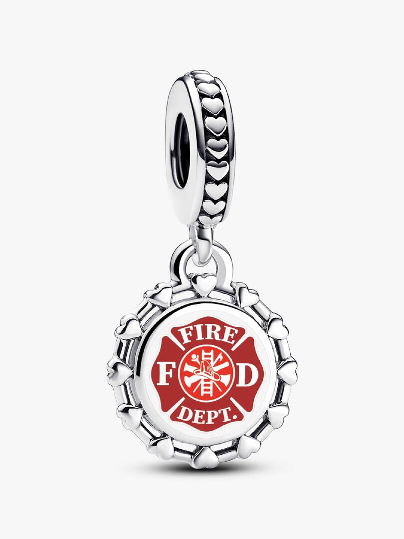 Celebrate the brave heroes of the fire department with this Engravable Firefighter Dangle Charm in sterling silver. Adorned with a row of hearts around the bale and edges, the front features a bold red fire department ba,dge, symbolizing the courage, sacrifice, and strength of those who run toward danger to protect others. Whether honoring a firefighter in your life or keeping their legacy close, add a special custom engraving on the back to make this charm a personal tribute to their unwavering commitment.