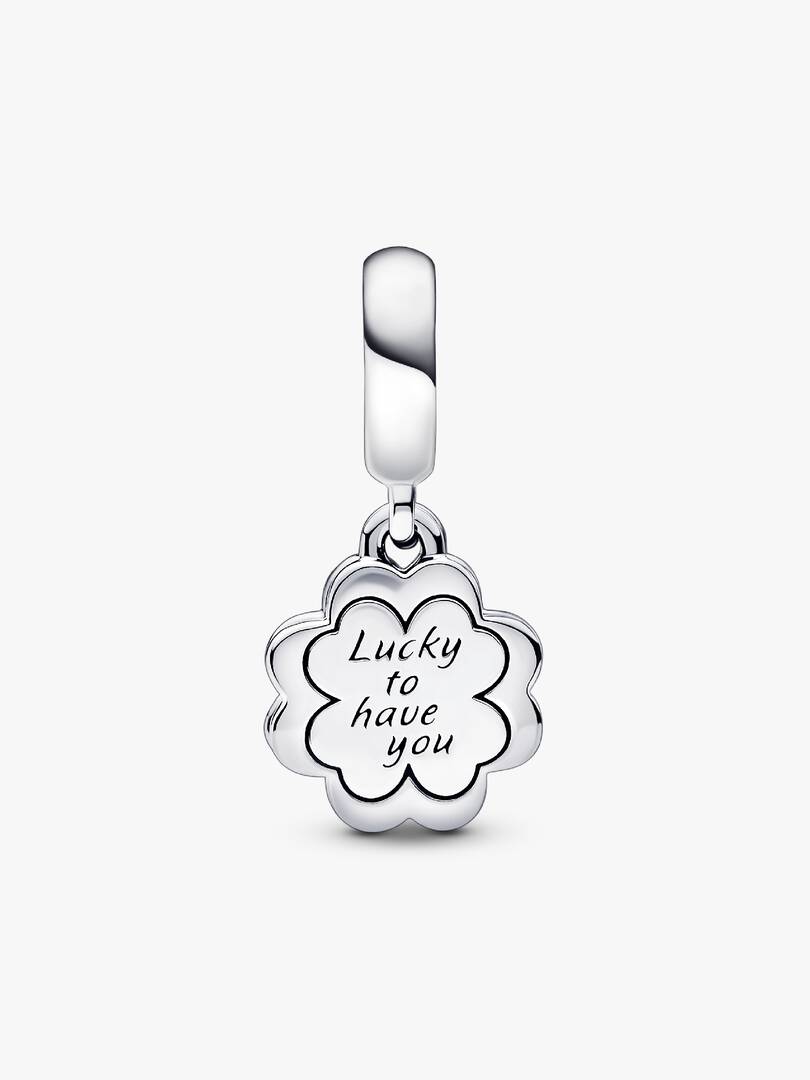 A twist on a well-known symbol of luck, our Four-leaf Clover Friendship Double Dangle Charm shines with a message of love and appreciation. Crafted from sterling silver, it features cut-out hearts coming together to form, a four-leaf clover on one dangle. The other dangle, also clover-shaped, is covered in powder pink enamel on one side and an engraving on the other: “Lucky to have you.?? The perfect addition to a friendship bracelet.