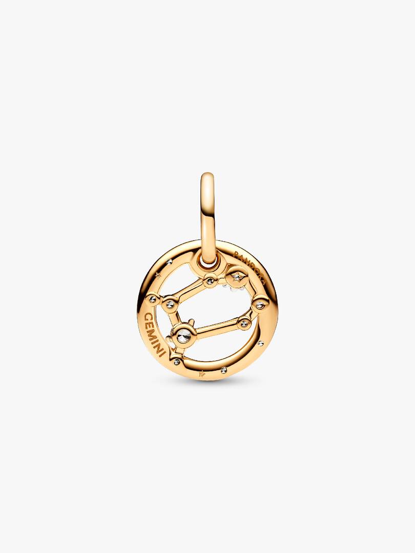 Let the stars guide your look with the Gemini Zodiac Dangle Charm. This Pandora Moments dangle charm is crafted our 14k gold-plated unique metal blend, has a circular outer frame and features clear sparkling cubic zircon,ia as well as the shape of the Gemini zodiac sign. The back side of the frame is engraved with “Gemini”. Whimsical, indecisive and brilliant, the Gemini in your life can always be counted on to be considering both sides of the argument and weighing them up equally. Wear it as a sign of your own sign’s strength or give it as a gift of appreciation to the Gemini in your life.