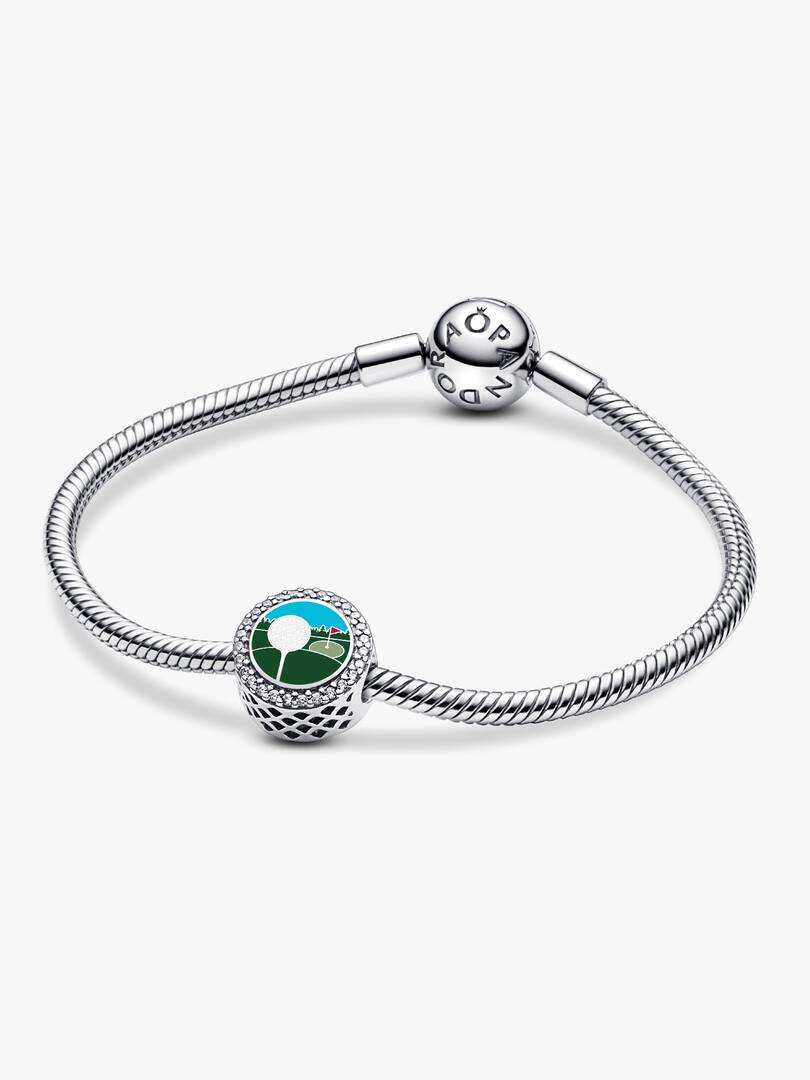 Tee up your style with this circular sterling silver golf charm, framed in sparkling cubic zirconias and ready for your custom engraving on the back.