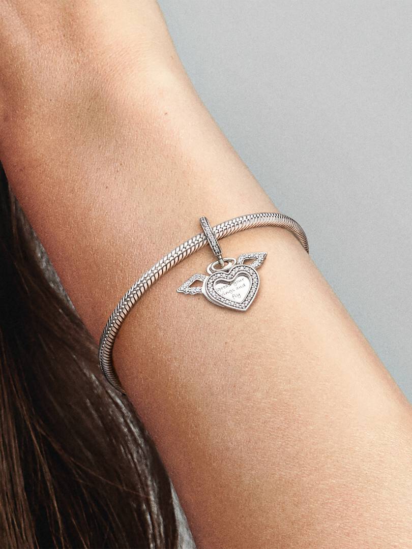 Always have your guardian angel watching over you with this Heart & Angel Wings Dangle Charm in sterling silver featuring cubic zirconia sparkles. Inspired by awe-inspiring otherworldly celestial beings, the heart-shaped, double dangle design features angel wings on the back and is topped with a delicate halo. The angel wing charm is engraved with the uplifting and inspirational words ??Spread your wings and fly?? to remind us to never let anything hold us back when it comes to the pursuit of our dreams.