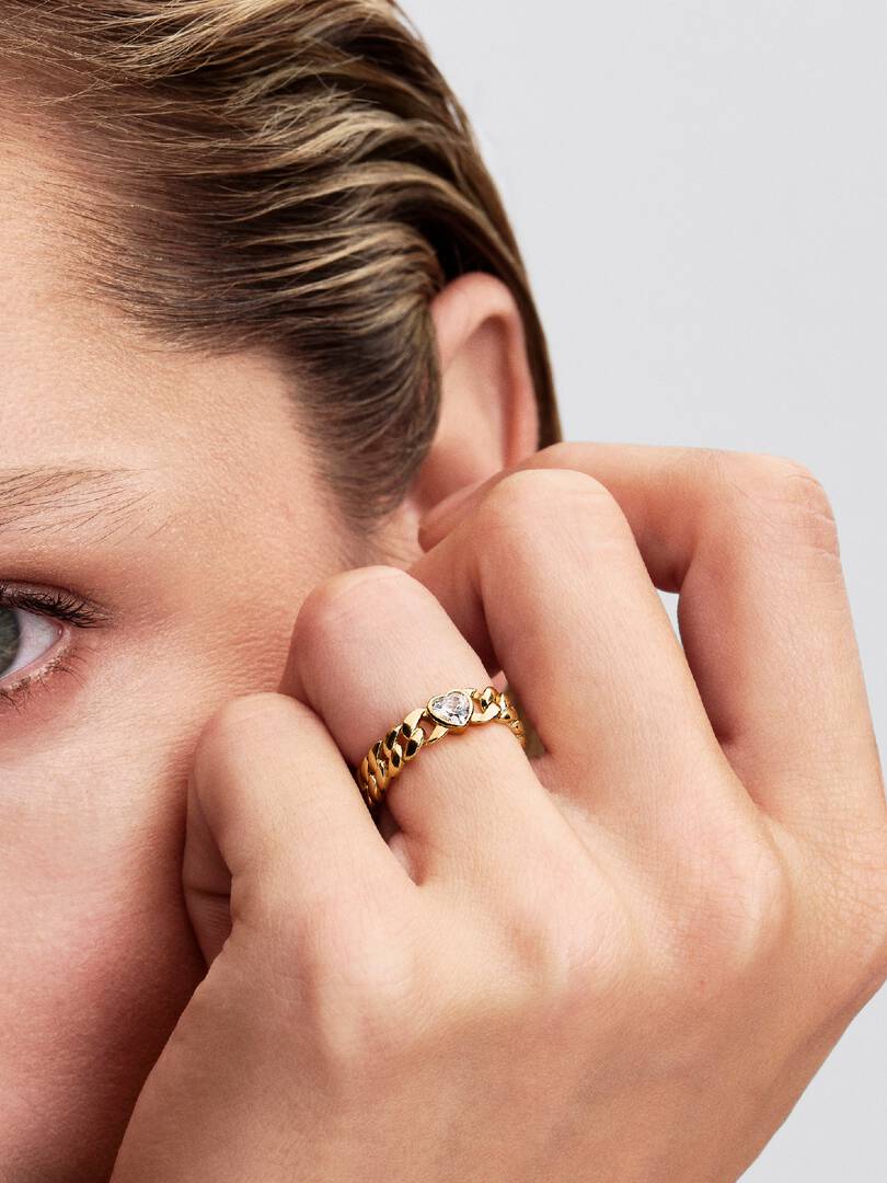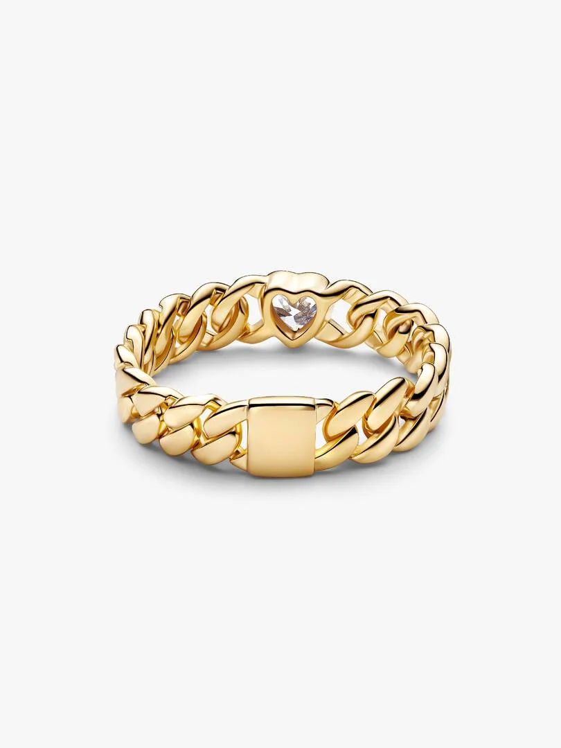 Go for bold. Our 14k gold-plated Cuban chain ring features one bezel-set heart-shaped cubic zirconia, blending modern romance with effortless edge.